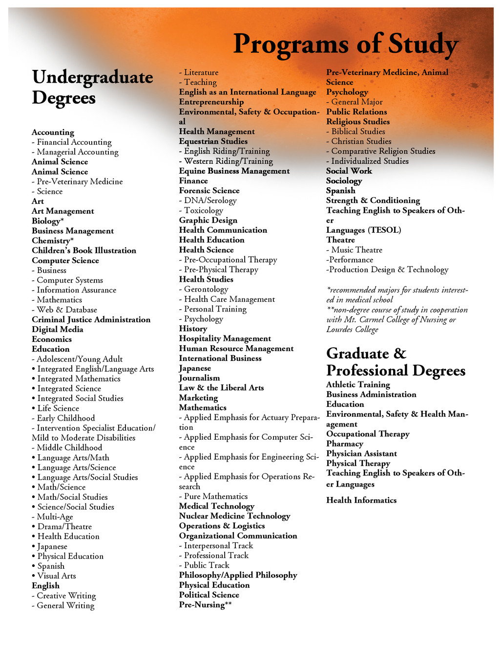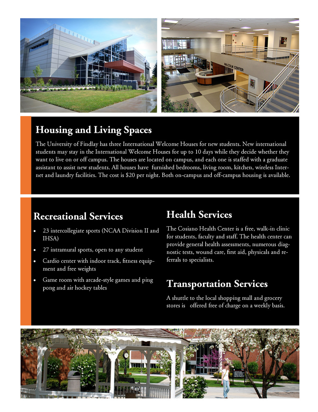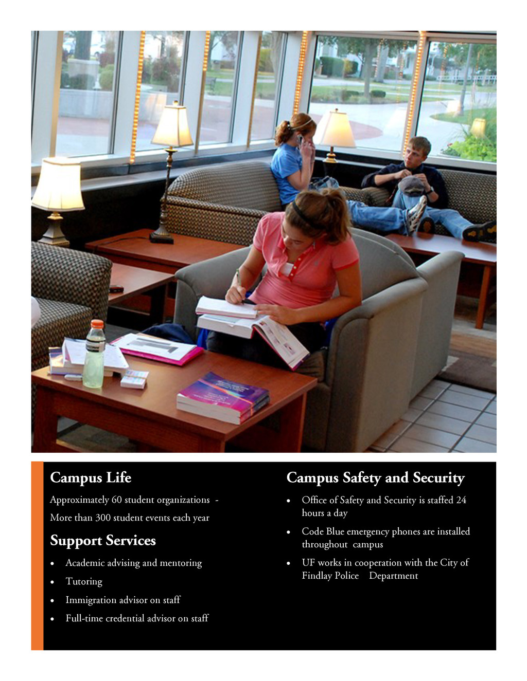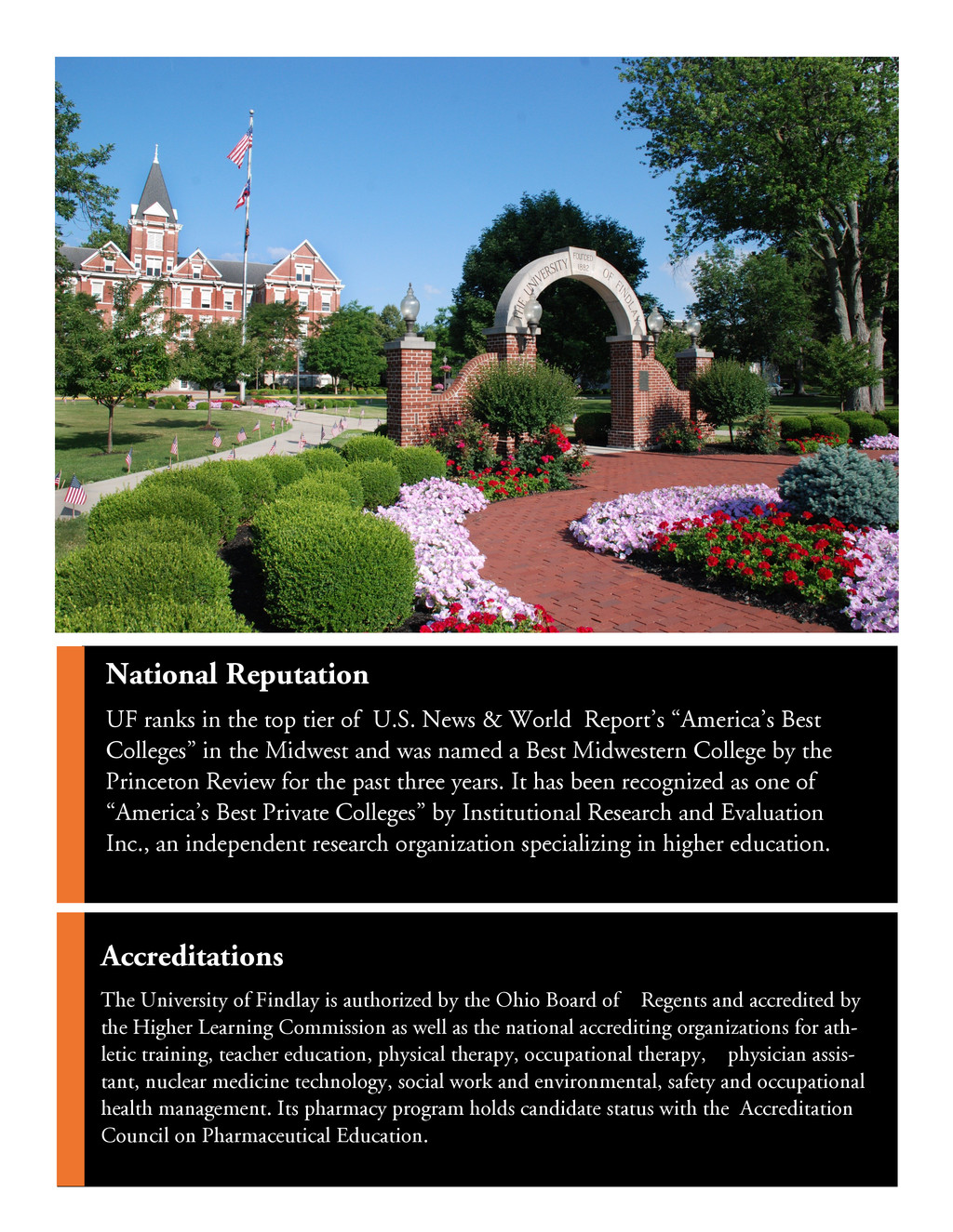 China, and chose The University of Findlay for two primary reasons. The first was the reputation and accreditation of the environmental, safety and health management program, which is nationally accredited by the U.S. Bureau of Educa- tion and well-known in the industry. The second reason for Lei’s choice was the peaceful and safe atmosphere that surrounds the campus. “I feel I have a home here in the U.S.,” said Lei. My Huyen Nguyen, a native of Vietnam says, “I chose The University of Findlay because I found out that UF has an amazing TESOL program with wonderful teachers. After coming to UF, I knew my decision was the right one. The campus is beautiful and safe. The people are friendly and helpful. On top of that, our school staff, especially the International Admissions and Services Office, is very hospi- table, tolerant and professional, and I really appreciate their kindness. I felt so warm inside and it was like I was home here in the U.S.” When Maria Eugenia Velasquez Zavarce, a native of Caracas, Venezuela, decided to continue her edu- cation, all signs pointed her toward The University of Findlay. “I found the University had a distin- guished MBA program accredited by recognized institutions, their tuition was reasonable and I had a very good feeling about the people in the University and the city,” said Maria Eugenia. Darryl Lai from Malaysia says, “I chose The University of Findlay because it has good Forensic Science and Biology programs. The classes and lab work are very hands-on, which allows me to learn more ef- fectively. I receive more personal attention with my professors compared to bigger universities I have attended. The faculty and staff members are very beneficial in helping me become well adjusted. Be- sides that, I love meeting people from all over the world just to get out of my comfort zone. One thing that sets UF apart is that Findlay is a safe town which is a key factor in choosing a university.” ch h .P. . Presidential Scholarship* 3.5 or higher $15,000 a year/renewable each year Deans' Scholarship* 3.0-3.49 $14,000 a year/renewable each year y w * 2.5 - 2.99 $10 000 / w b ch w * 2.0 - 2.49 $8 000 / w b B & E OH ch h $2 000 & b Graduate Scholarship** $1 000 x. ELP $1,500 a year *Available only to Undergraduate students. **Available to all graduate programs except MBA & ESOH Scholarships are available for fall and spring semesters only. Website: www.findlay.edu Email: