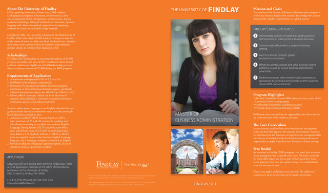 of the Master of Business Administration program is to develop business leaders who translate knowledge into actions that provide valuable contributions to a global society. FINDLAY’S MBA GRADUATES: Demonstrate qualities of leadership, professionalism and teamwork in making ethical business decisions. Communicate effectively in a variety of business settings. Excel in a diverse, dynamic global economic environment. Effectively identify, analyze and solve business-related problems, as well as pursue business opportunities proactively. Exhibit knowledge, skills and technical competencies appropriate to general business fields and the students’ chosen MBA concentration(s). Program Highlights • All main* textbooks for your MBA classes are free as part of the University’s book rental program • Scholarships available for qualifying students • Personal and professional advising available *Additional course material may be suggested for some classes and are up to the discretion of the student to purchase. The Core Curriculum In core courses, students learn how business and management work and how they apply to the external environment. Students are introduced to the functions of organizations, managerial skills and the use of analytical tools for decision making and have an opportunity to apply what they have learned in various settings. Free Books! As a student in Findlay’s MBA program, you don’t have to worry about paying for your textbooks each term. All main* textbooks for your MBA classes are free as part of the University’s book rental program. You have the option to buy it at a reduced rate once the semester is over. *Classes may suggest additional course material. The additional materials are up to the discretion of the student to purchase. The University of Findlay offers associate’s, bachelor’s, master’s and professional doctorate degree classes and is fully accredited by the Higher Learning Commission. The Higher Learning Commission, 230 South LaSalle Street, Suite 7-500, Chicago, IL 60604 Phone: 312-263-0456 or 800-621-7440 | FAX: 312-263-7462 | www.ncah.org About The University of Findlay UF is a growing institution of more than 3,600 students. Undergraduate programs in business, environmental, safety and occupational health management, animal science, nuclear medicine technology, bilingual multicultural education, Japanese language and others have gained a reputation for preparing students for careers in areas with a high demand. Founded in 1882, the University is located in the Midwest city of Findlay, Ohio with nearly 40,000 residents. Campus is near the of the center of town in a safe, tree-lined residential area. Students from many states and more than 30 countries and territories globally choose to continue their education at UF. Scholarships UF offers IELP scholarships to international students of $1,500 per year, renewable each year of IELP enrollment. International graduate students are eligible for a $1,000 scholarship per year with a maximum amount of $2,000 during the MBA program. Requirements of Application 1. A minimum undergraduate GPA of 2.5 on a 4.0. 2. Fulfillment of prerequisite competencies. 3. Possession of a baccalaureate degree from an accredited institution or first-professional doctorate-degree, specifically when no baccalaureate degree was offered (e.g., PharmD. etc.). 4. Submit official transcripts, which can be in the form of attested credentials from a University-recognized document verification agency, of all college-level work. Students whose native language is not English and who have not graduated from American universities must meet the previously listed admissions conditions plus: 1. Achieved a verified TOEFL Internet-based test (iBT) min. total score of 79 with 20 or better in speaking and 20 or better in writing or a verified international English Language Testing System (IELTS) academic score with a min. overall band score of 6.5 (with no individual band score below a 6.5). Students without a TOEFL or IELTS score are required to test in the Intensive English Language Program, and if necessary, complete coursework in English. 2. Provide an affidavit of financial support (original), if not an American citizen or permanent resident. APPLY NOW Applying is free and can be done online at findlay.edu. Please send all application materials to the Office of International Admissions at The University of Findlay. 1000 N. Main St., Findlay, OH 45840 419-434-4558 (Phone) | 419-434-5507 (Fax)