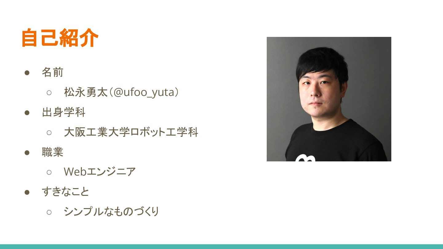 自己紹介 • 名前 ◦ 松永勇太(@ufoo_yuta) • 出身学科 ◦ 大阪工業大学ロボット工学科 •