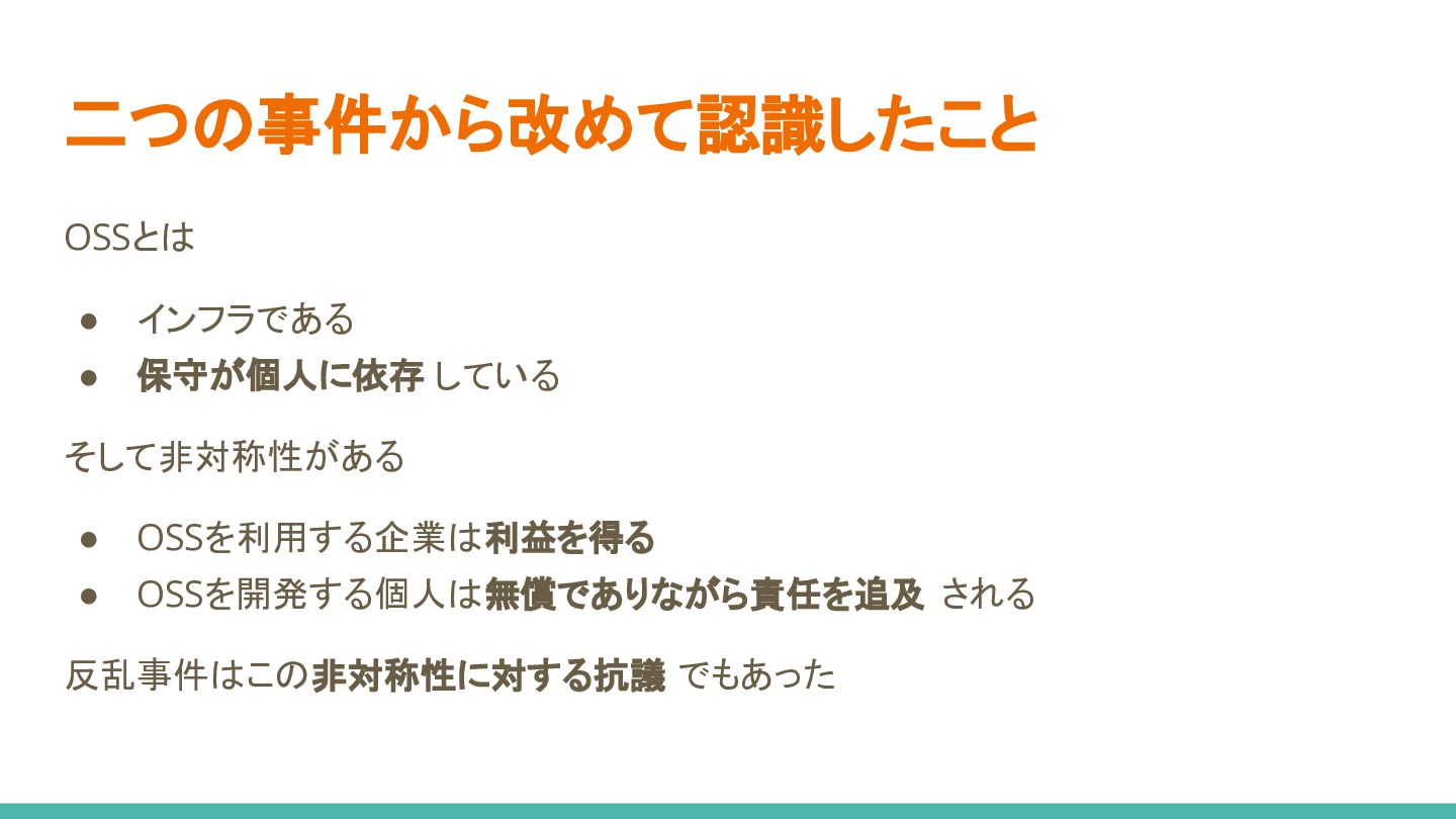 二つの事件から改めて認識したこと OSSとは • インフラである • 保守が個人に依存 している そして非対称性がある • OSSを利用する企業は利益を得る