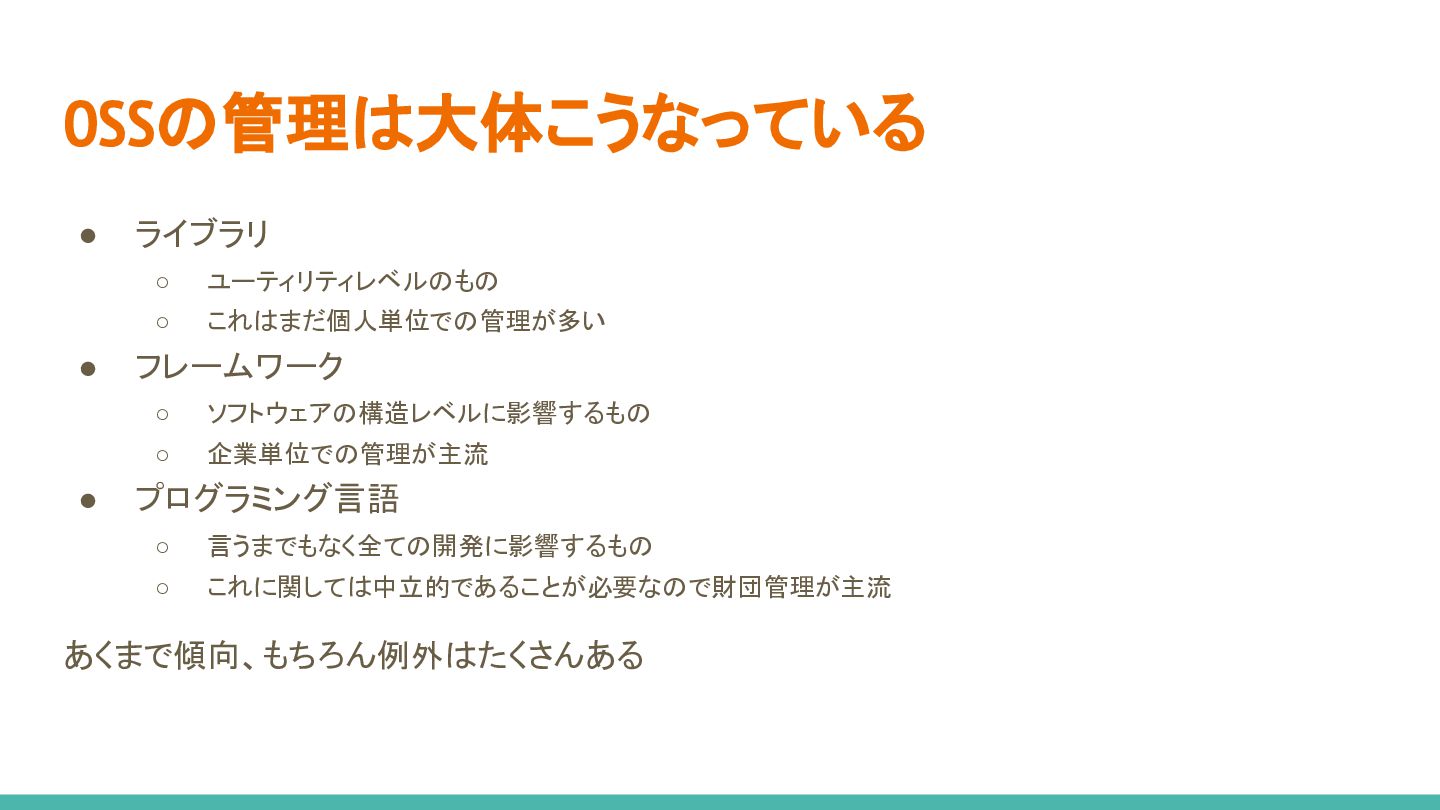 OSSの管理は大体こうなっている • ライブラリ ◦ ユーティリティレベルのもの ◦ これはまだ個人単位での管理が多い • フレームワーク ◦