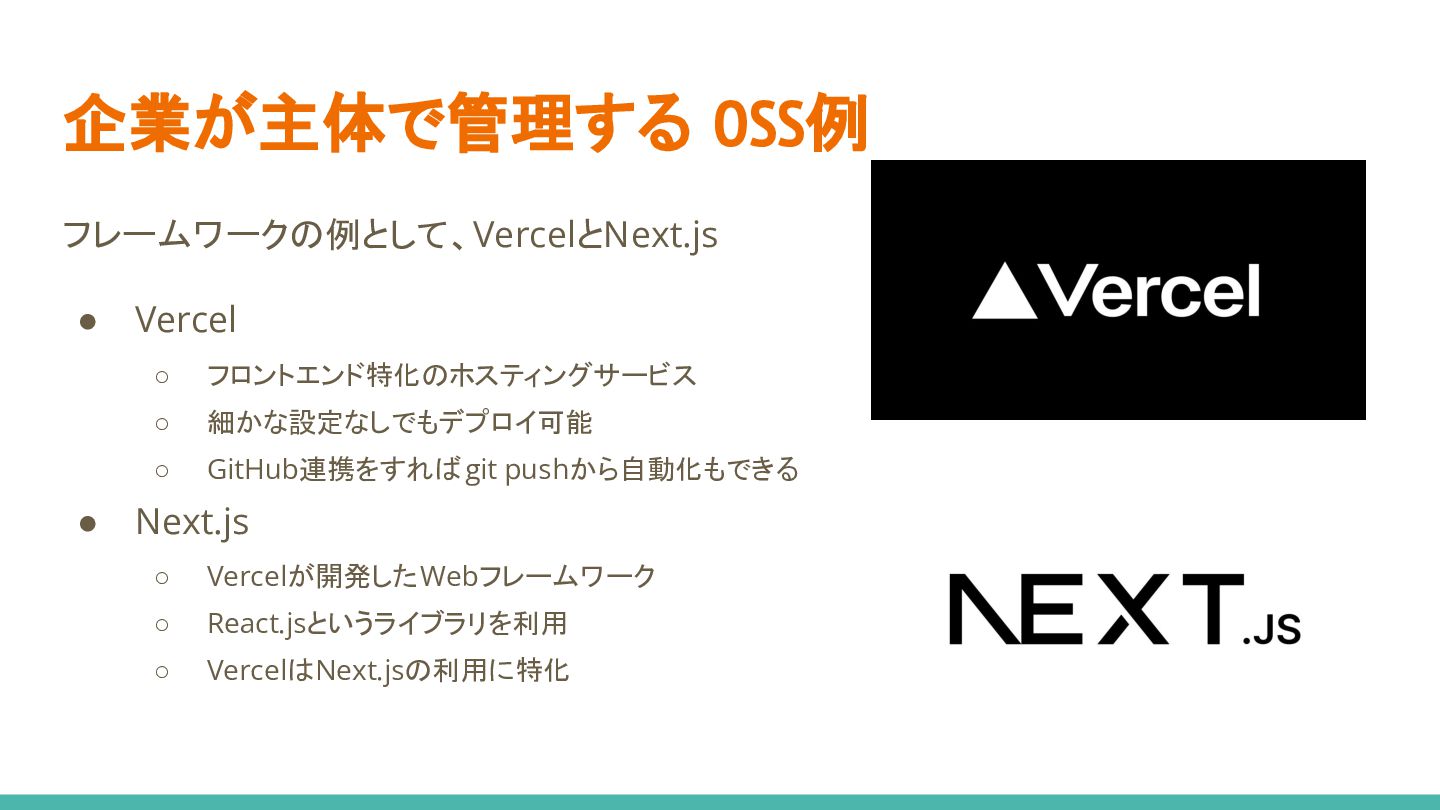 企業が主体で管理する OSS例 フレームワークの例として、VercelとNext.js • Vercel ◦ フロントエンド特化のホスティングサービス ◦ 細かな設定なしでもデプロイ可能 ◦