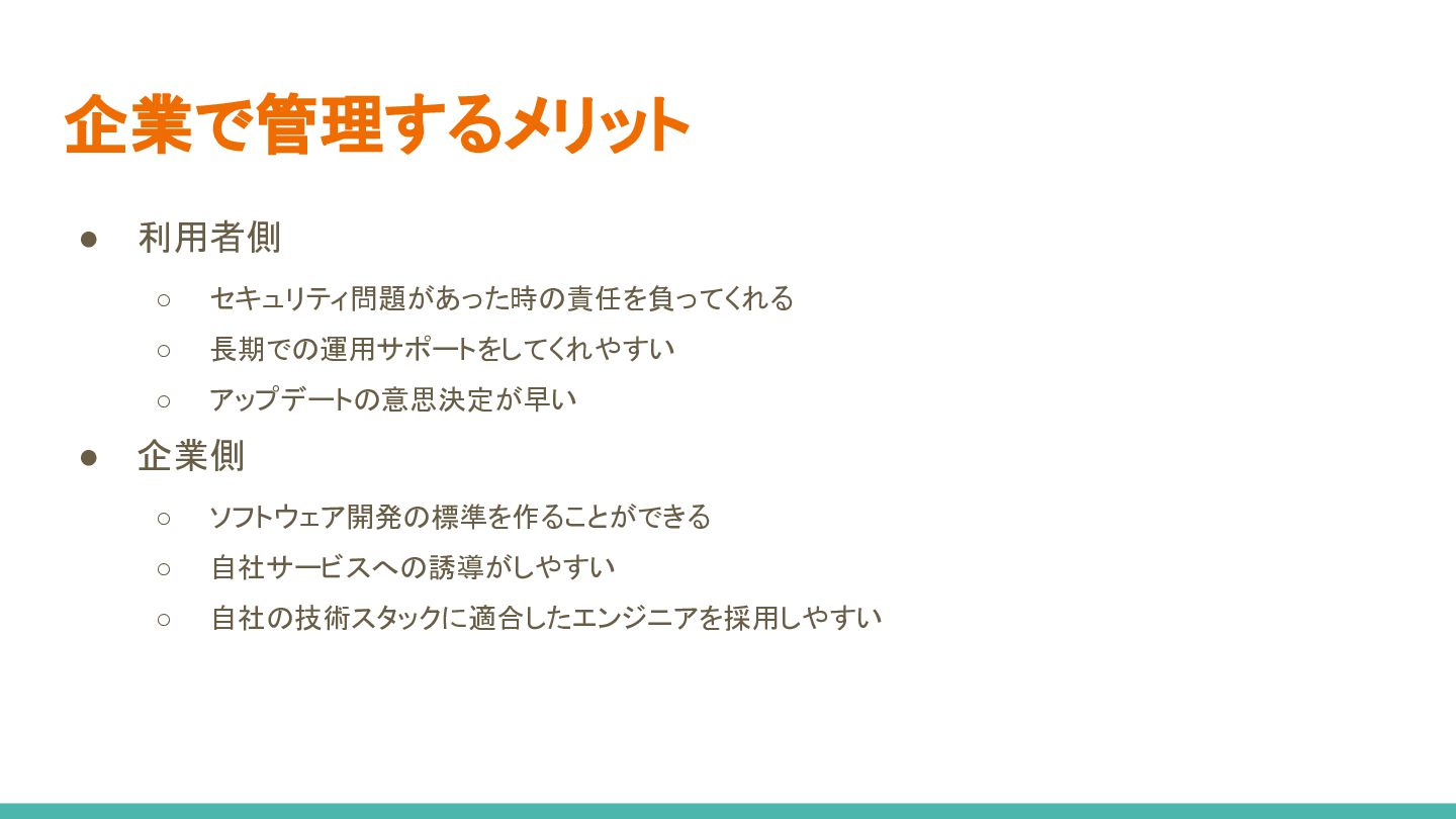 企業で管理するメリット • 利用者側 ◦ セキュリティ問題があった時の責任を負ってくれる ◦ 長期での運用サポートをしてくれやすい ◦ アップデートの意思決定が早い •