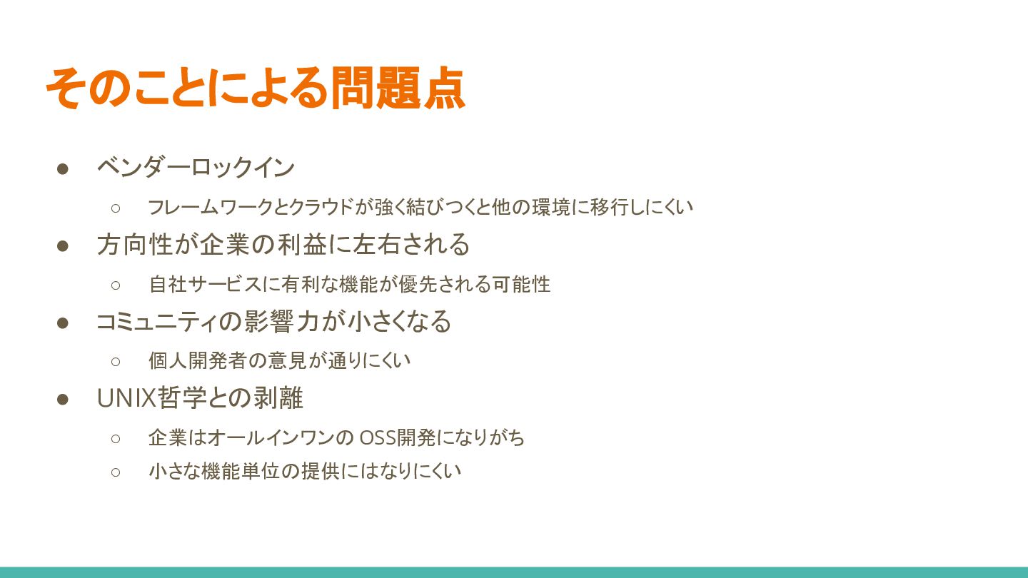 コミュニティの影響力が小さくなる ◦ 個人開発者の意見が通りにくい • UNIX哲学との剥離 ◦ 企業はオールインワンの OSS開発になりがち ◦ 小さな機能単位の提供にはなりにくい