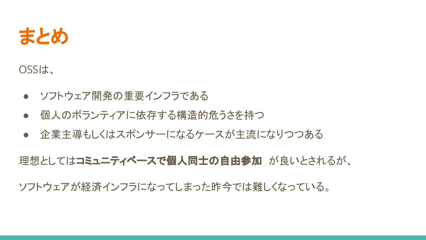 まとめ OSSは、 • ソフトウェア開発の重要インフラである • 個人のボランティアに依存する構造的危うさを持つ • 企業主導もしくはスポンサーになるケースが主流になりつつある 理想としてはコミュニティベースで個人同士の自由参加 が良いとされるが、