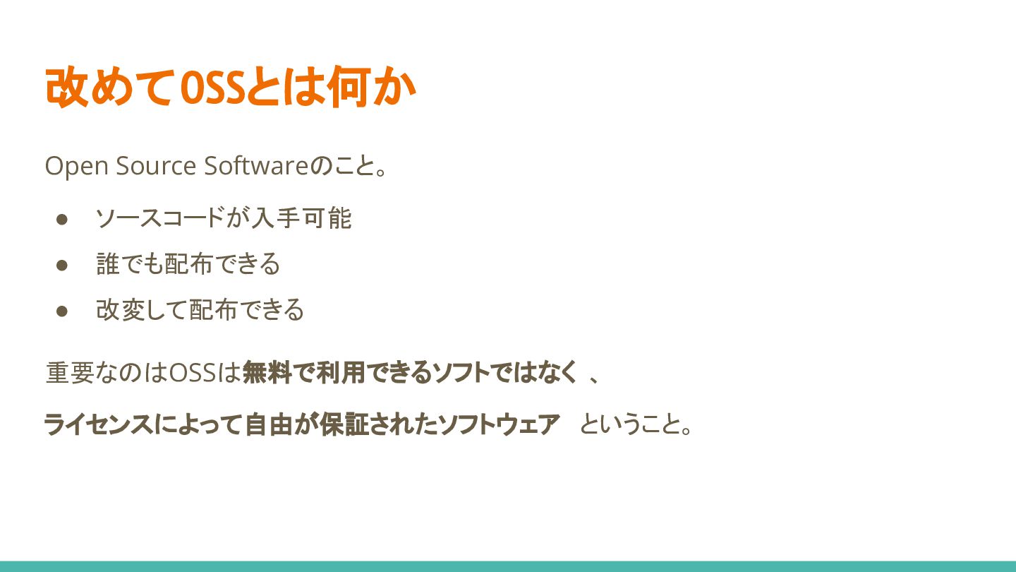 重要なのはOSSは無料で利用できるソフトではなく 、 ライセンスによって自由が保証されたソフトウェア ということ。