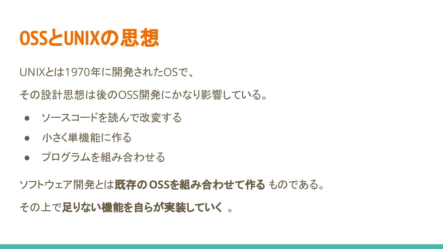 OSSとUNIXの思想 UNIXとは1970年に開発されたOSで、 その設計思想は後のOSS開発にかなり影響している。 • ソースコードを読んで改変する • 小さく単機能に作る • プログラムを組み合わせる ソフトウェア開発とは既存のOSSを組み合わせて作る