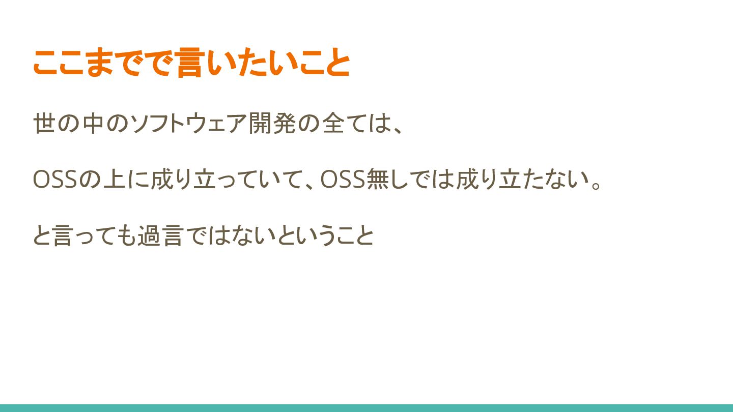 ここまでで言いたいこと 世の中のソフトウェア開発の全ては、 OSSの上に成り立っていて、OSS無しでは成り立たない。 と言っても過言ではないということ