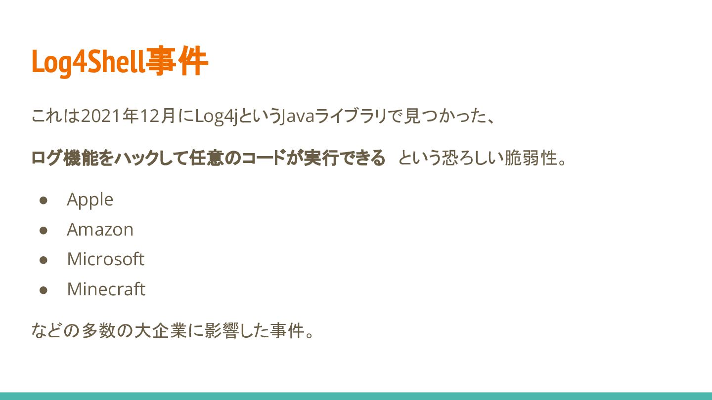 Log4Shell事件 これは2021年12月にLog4jというJavaライブラリで見つかった、 ログ機能をハックして任意のコードが実行できる という恐ろしい脆弱性。 • Apple • Amazon • Microsoft