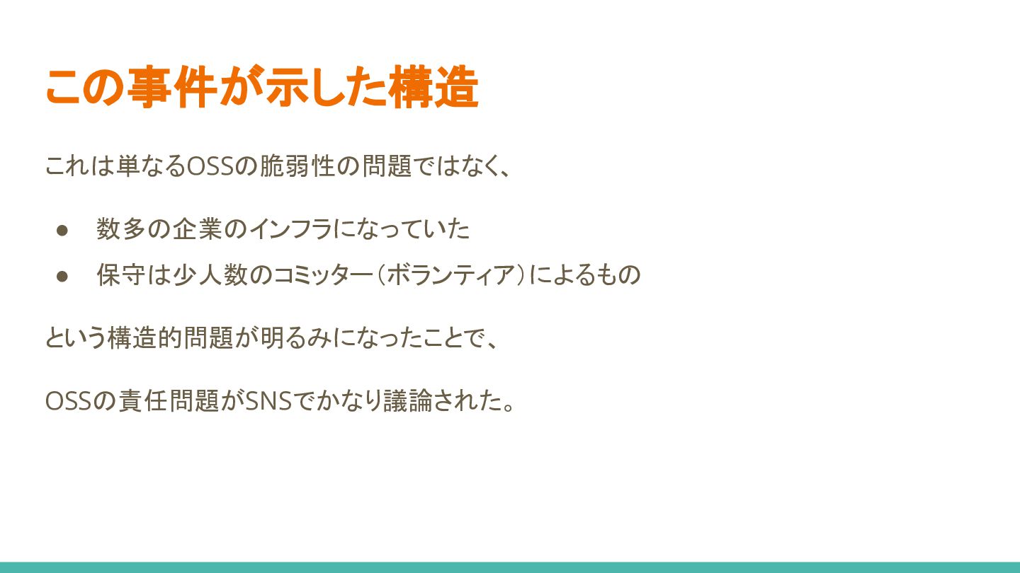 この事件が示した構造 これは単なるOSSの脆弱性の問題ではなく、 • 数多の企業のインフラになっていた • 保守は少人数のコミッター(ボランティア)によるもの という構造的問題が明るみになったことで、 OSSの責任問題がSNSでかなり議論された。