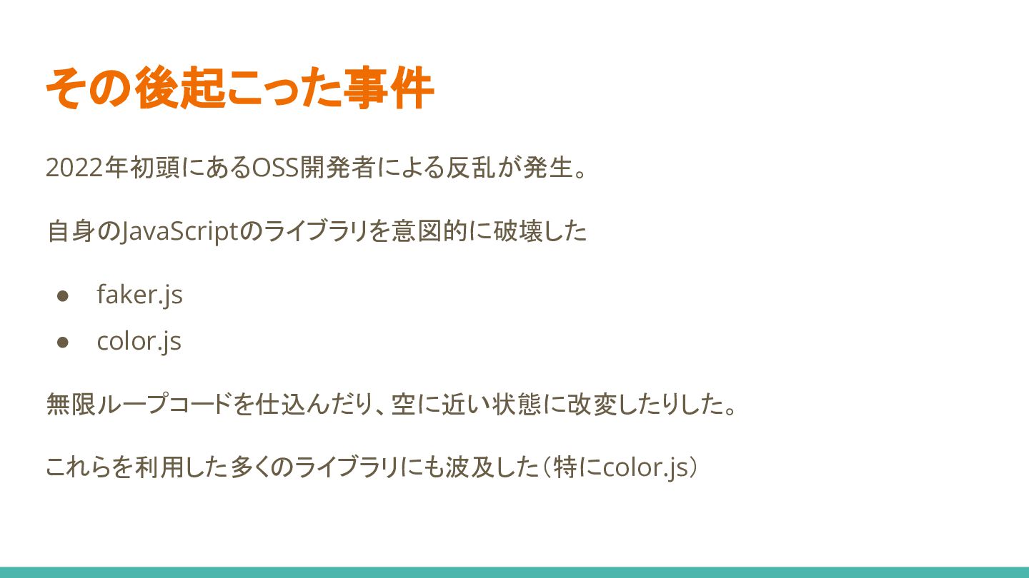その後起こった事件 2022年初頭にあるOSS開発者による反乱が発生。 自身のJavaScriptのライブラリを意図的に破壊した • faker.js • color.js 無限ループコードを仕込んだり、空に近い状態に改変したりした。 これらを利用した多くのライブラリにも波及した(特にcolor.js)