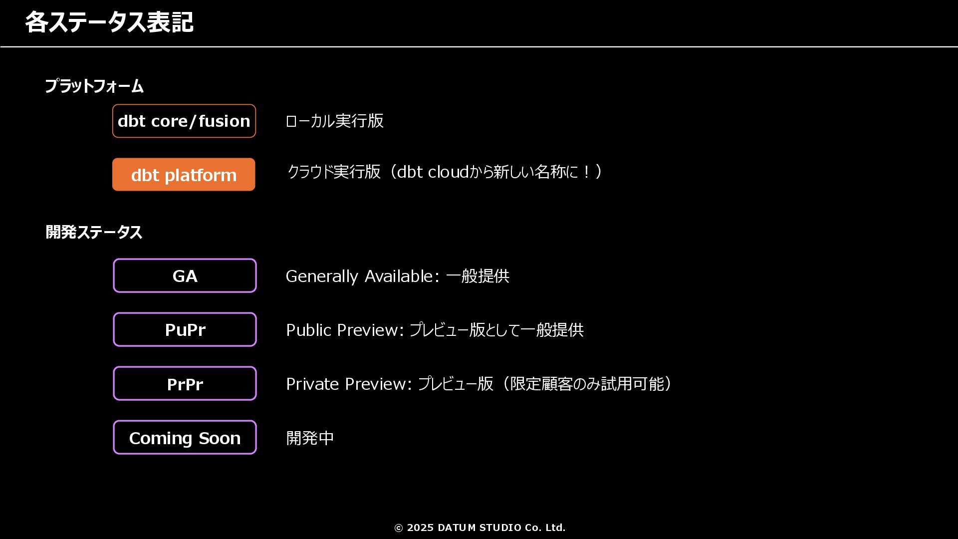 © 2025 DATUM STUDIO Co. Ltd. 各ステータス表記 dbt core/fusion dbt