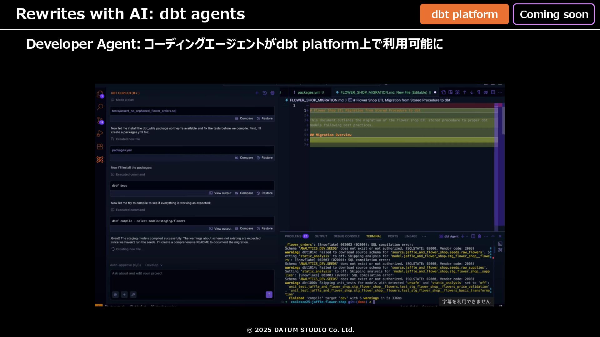 agents Developer Agent: コーディングエージェントがdbt platform上で利用可能に dbt platform Coming soon