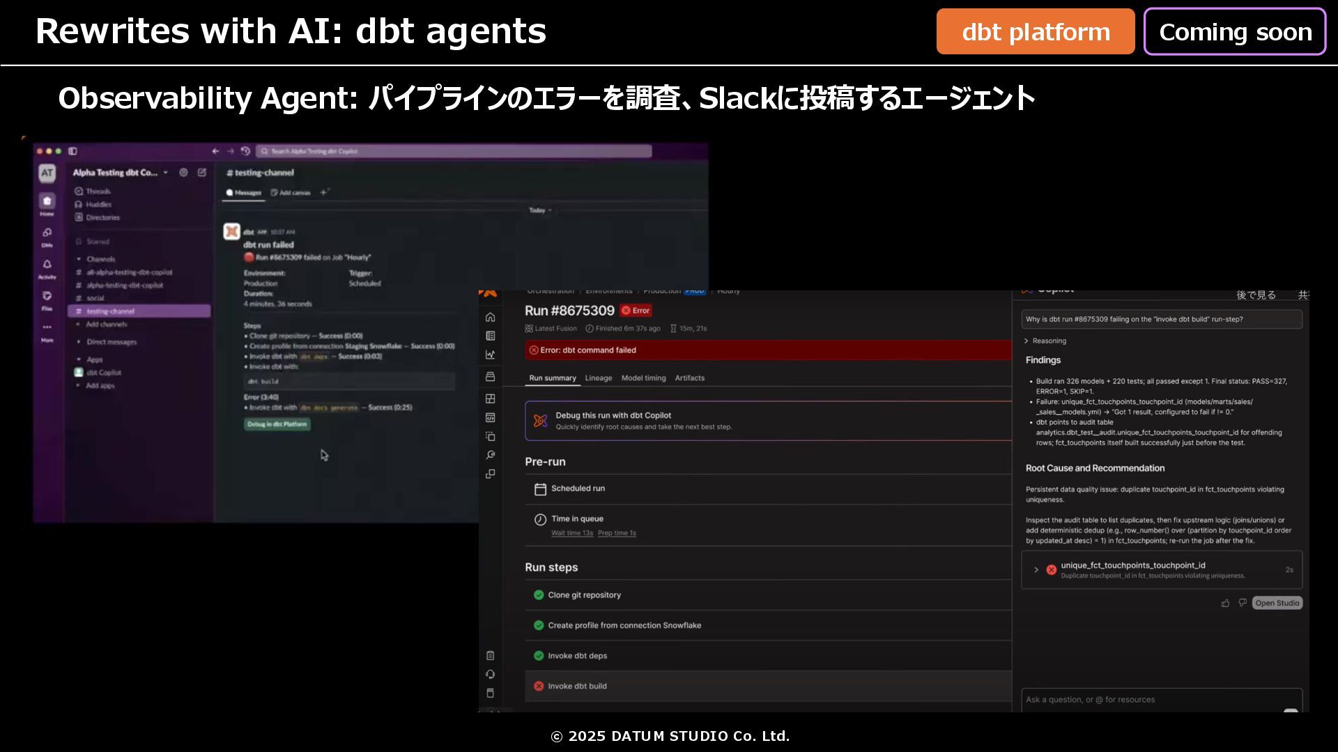 agents Observability Agent: パイプラインのエラーを調査、Slackに投稿するエージェント dbt platform Coming soon