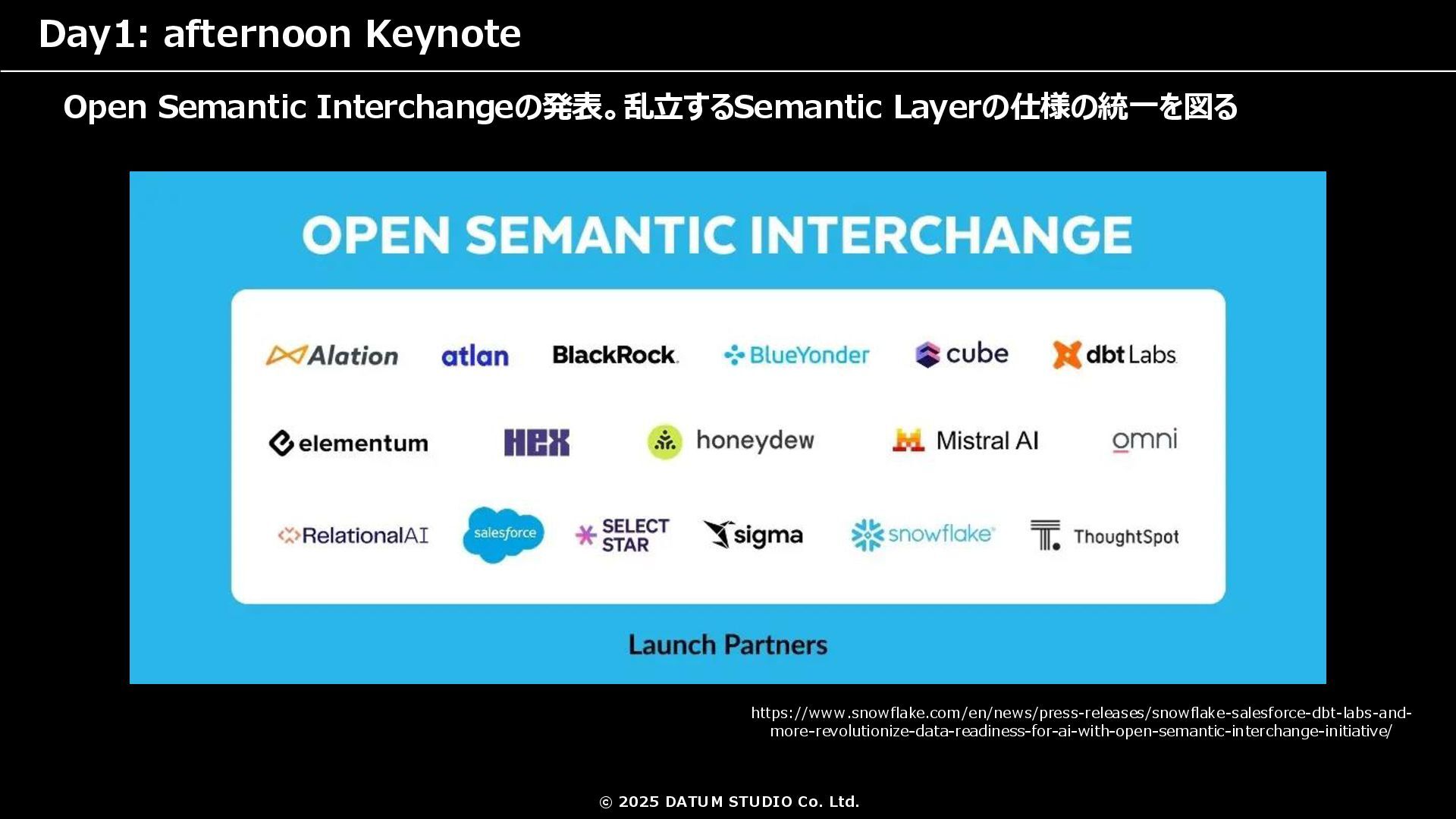 Semantic Interchangeの発表。乱立するSemantic Layerの仕様の統一を図る https://www.snowflake.com/en/news/press-releases/snowflake-salesforce-dbt-labs-and- more-revolutionize-data-readiness-for-ai-with-open-semantic-interchange-initiative/