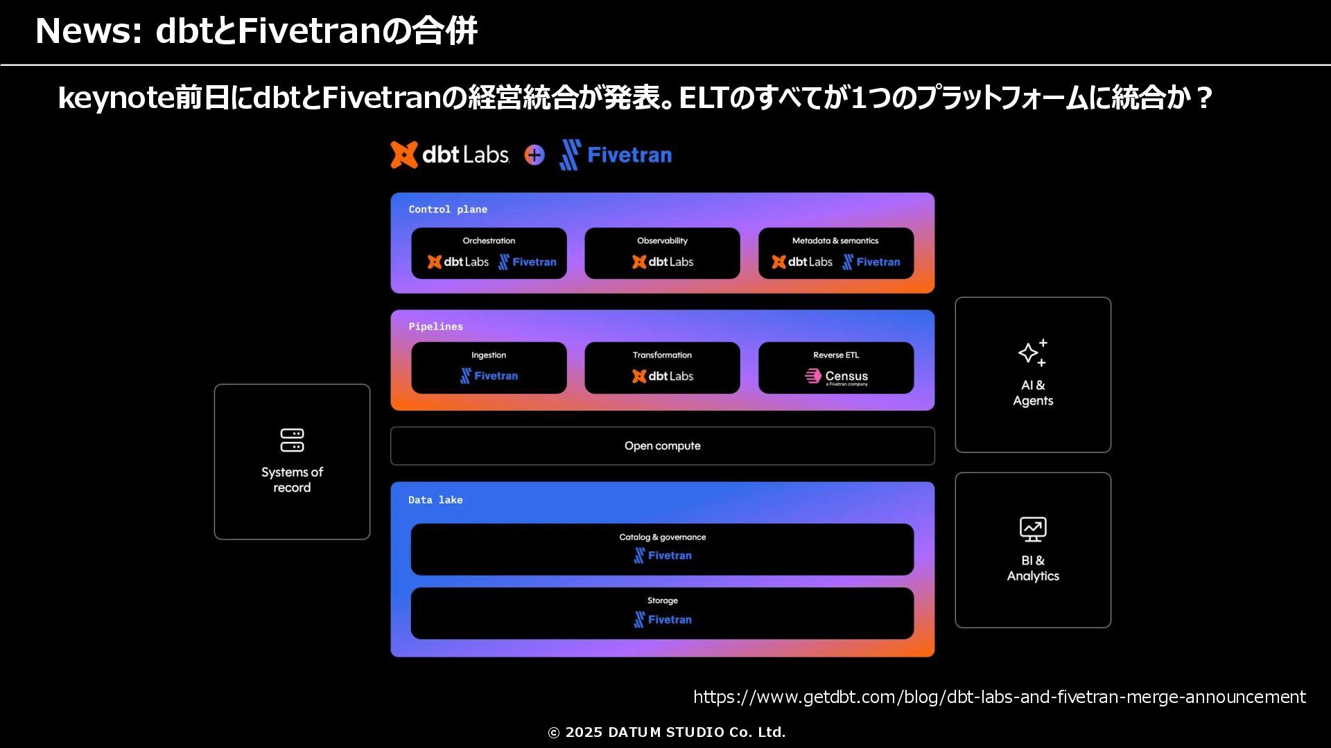 © 2025 DATUM STUDIO Co. Ltd. News: dbtとFivetranの合併 keynote前日にdbtとFivetranの経営統合が発表。ELTのすべてが1つのプラットフォームに統合か? https://www.getdbt.com/blog/dbt-labs-and-fivetran-merge-announcement
