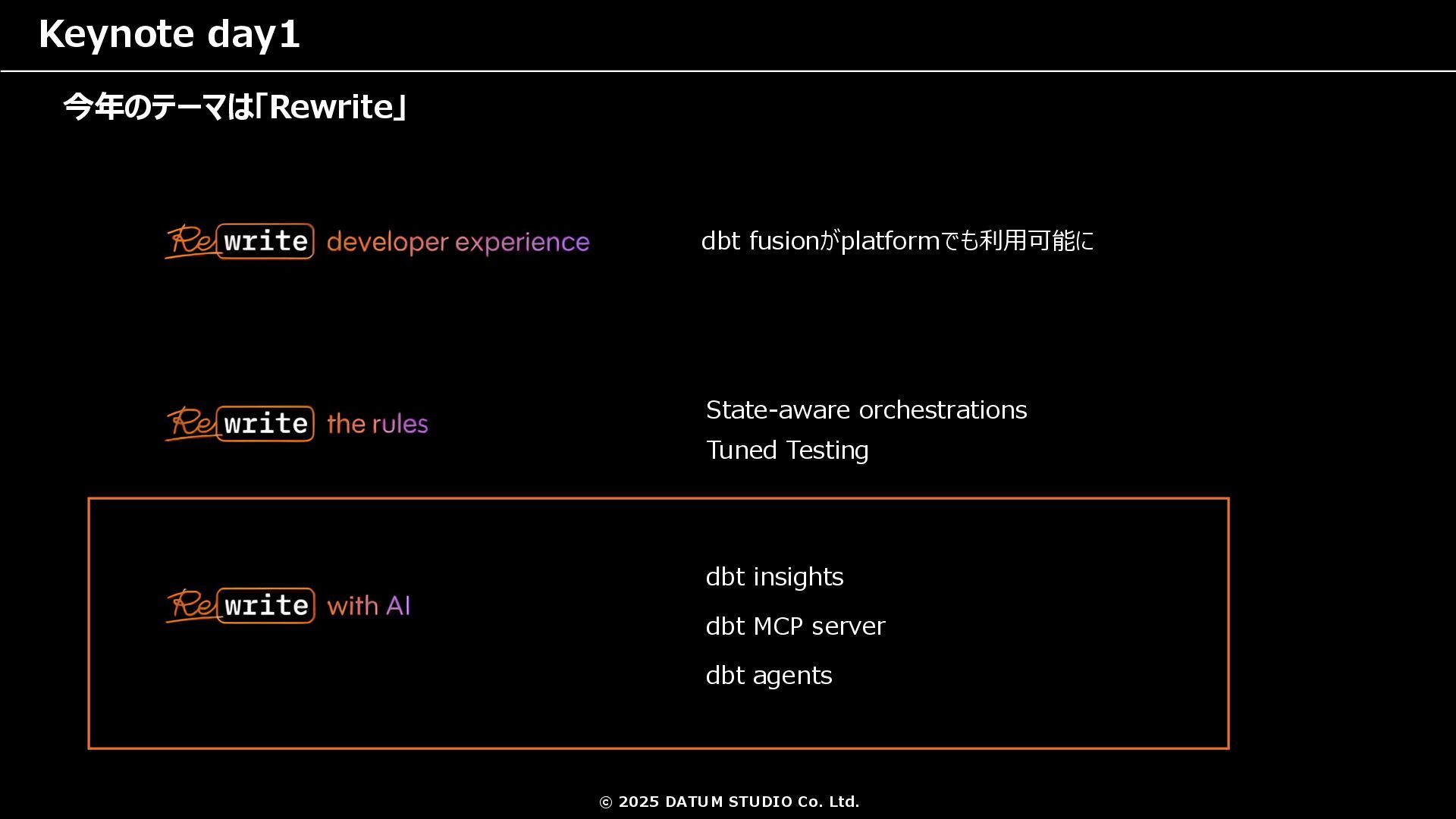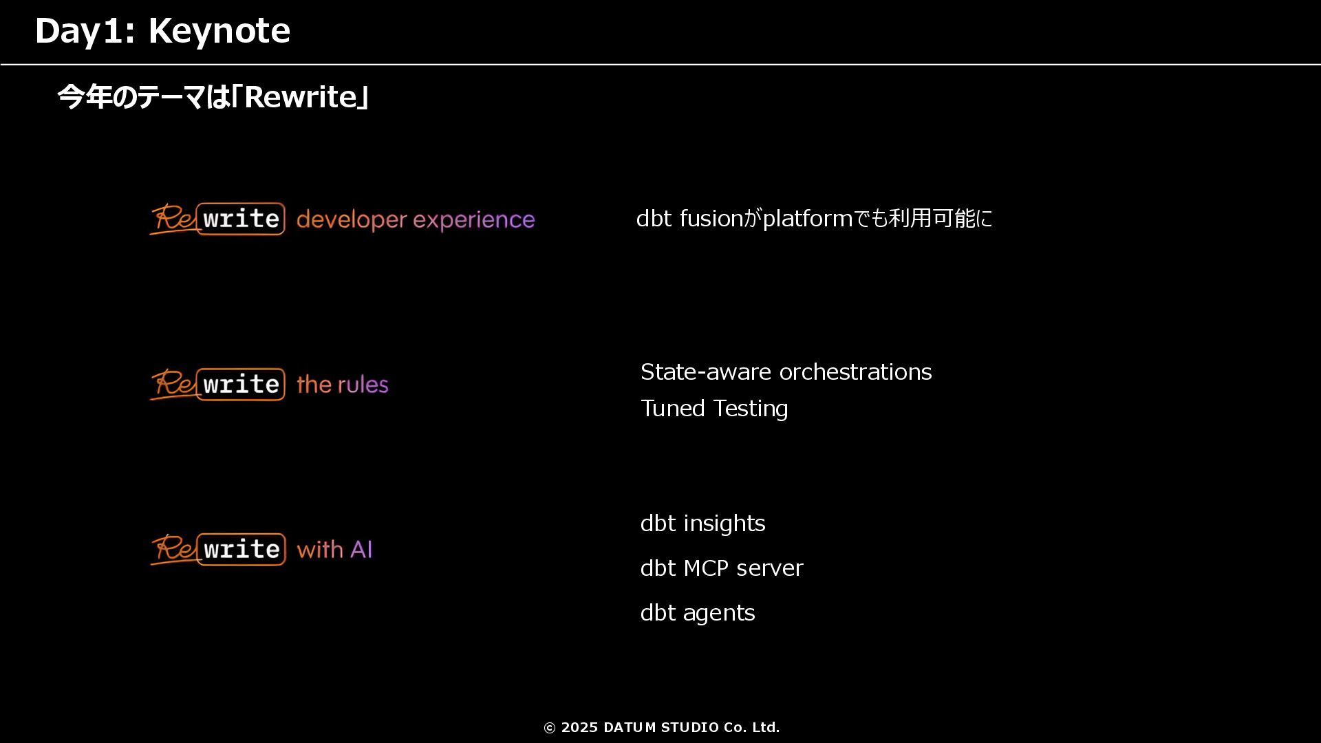 © 2025 DATUM STUDIO Co. Ltd. Keynote day1 今年のテーマは「Rewrite」 dbt