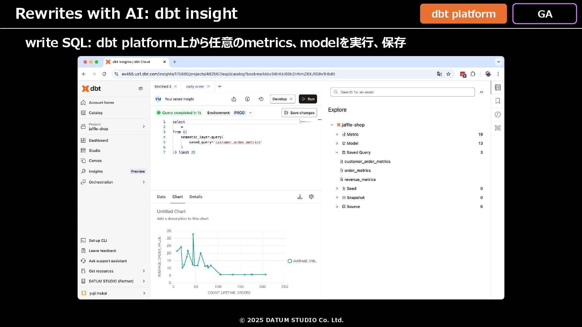 insight write SQL: dbt platform上から任意のmetrics、modelを実行、保存 dbt platform GA