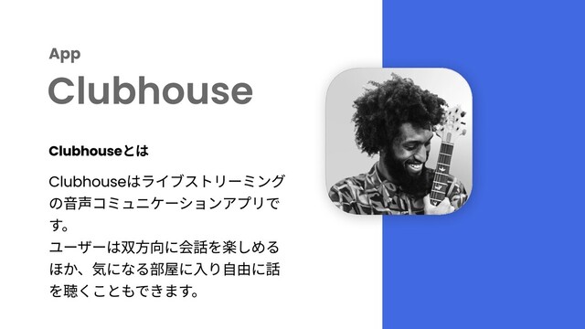 App Clubhouse Clubhouseはライブストリーミング の音声コミュニケーションアプリで す。 ユーザーは双方向に会話を楽しめる ほか、気になる部屋に入り自由に話 を聴くこともできます。 Clubhouseとは