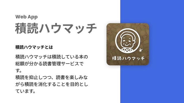 Web App 積読ハウマッチ 積読ハウマッチは積読している本の 総額が分かる読書管理サービスで す。 積読を抑止しつつ、読書を楽しみな がら積読を消化することを目的とし ています。 積読ハウマッチとは