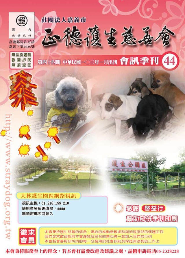 發行人:陳幸枝 編輯:陳淑英 會址:嘉義市西區世賢路一段839號 電話:05-2911359 / 傳真:05-2313129 網址:http://www.straydog.org.tw 臉書:http://www.facebook.com/pages/社團法人正 德護生慈善會/134071313274994 信箱: