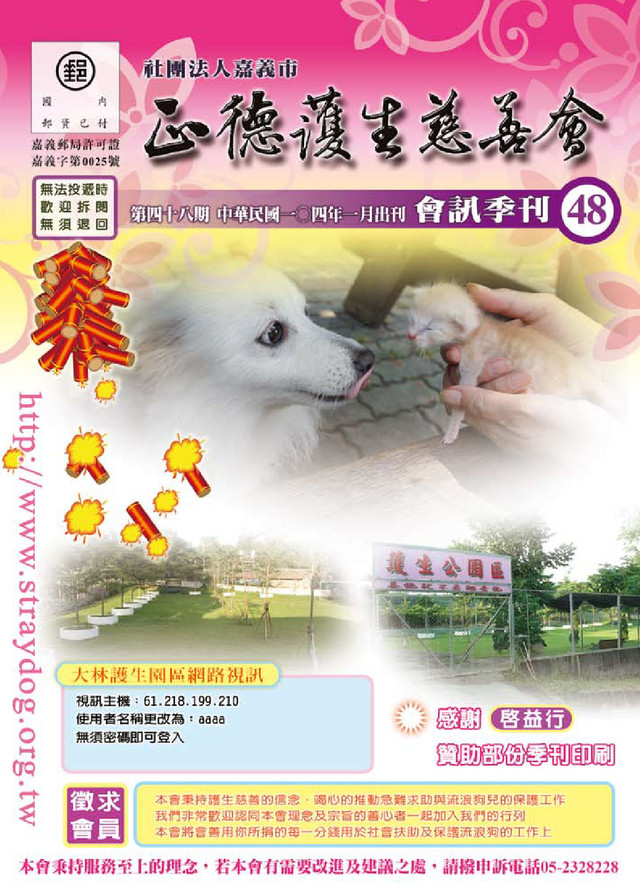 案由: 案主與案妻於11月23日,帶家中三個分別就 讀國小三、四、五年級小孩,至嘉義縣布袋鎮 「好美寮避風港」出海口內海沙灘釣魚及玩 水,期間案次子落水,案主下水欲救案次子, 疑似踩到流沙,與案次子被湍急潮水帶往外 海,案長子伸手要拉案主也落水,案妻見狀趕 來救案長子,疑踩空載浮載沉,實質海水退 潮,案家4人被水流帶往外海,案長子及案次 子被釣客救起,案主夫妻不幸罹難。案主原經 營機車維修,夫妻雙雙罹難後遺留三個求學中 幼子,目前案子暫由案妹照顧,但後續生活費 及教育費極需外界協助。 本會急難救助12,000元、白米6包 戶號:733 蔡X財 年齡80歲 住址:嘉義縣 案由: 案主80歲,日前 因感冒引起心肺衰 竭,於11月23日 往生。案長子已往 生多年,案長孫在 外地就業,周末才 回家。案次孫智力 稍弱,且有被愛妄想症,目前待業中。案長媳 有氣喘病,與案次孫與案主同住。據案妻言: 案次子有恐慌症、妄想症,目前仍在家中,並 未就業。案家無中低收入戶資格,本會衡量案 家人口數多,除施棺暨喪葬補助外,更補助白 米6包,協助案家生活。 本會施棺暨喪葬補助30,000元、白米6包 12/5出殯 施棺者: 王國立、陳幸枝、王宥甯、王姿雅、王柔雅、 王柏雄 戶號:734 蔡X苟 年齡78歲 住址:雲林縣 案由:案主因腦血管病變 ﹝ 俗 稱 中 風 ﹞ , 發 病 約 一 星 期 後 於11月28日往生 案 主 生 育 四 子 , 案 長 子 於 數 年 前 往生,遺留2個兒 女,案次子及案三子據案四子言:未即成長即 往生,目前案家只剩案四子,予案主夫妻同住 但不同戶。案四子與外籍女子結婚,於去年離 婚,生育一對兒女,分別為10歲、11歲,案四 子有二款低收入戶資格。由於須照顧案夫及案 主,無法外出工作,長期依賴補助款生活。 本會施棺暨喪葬補助30,000元、白米6包 12/15出殯 施棺者:簡全東﹝100/09﹞ 戶號:735 蔡X川 年齡50歲 住址:嘉義縣 案由: 案主今年37歲, 無 胃 炎 就 診 紀 錄 , 日 前 病 發 送 醫 , 診 斷 出 胃 癌 後短短10日即往 生。案主與案兄均 未婚,案主原本預 計與女友明年完婚,離開的太突然。案父母均 已年邁,案父有老人津貼,但案母尚未具有領 取資格,平日生活支出由案家兄弟負擔案主發 病突然往生,案家措手不及,案家父母均已年 邁,無法負擔案主喪葬費用,懇請補助。 本會施棺暨喪葬補助30,000元、白米6包 12/10出殯 施棺者:何文恭﹝98/05-103/11﹞ 戶號:738 莊X林 年齡81歲 住址:嘉義縣 案由: 案 主 罹 患 糖 尿 病 多年,於12月20 日 因 心 肌 梗 塞 往 生。案主生前與案 長 子 、 案 三 子 同 住。案長子與案三 子均在朴子工業區 內工作,前者在螺絲工廠,每月二萬餘元。後 者在豆粉工廠,按日計酬,每月薪資萬餘元。 二人分別有求學中幼兒須照顧。案長子為政府 列冊中低收入戶。案家生活本就不豐裕,案主 三個兒子分別都有求學中小孩需照顧,經濟負 擔沉重。 本會施棺暨喪葬補助30,000元、白米6包 12/28出殯 施棺者:黃蔡秀卿﹝100/07﹞ 戶號:739 李X邦 年齡69歲 住址:雲林縣 案由: 案主有老年失智,長期臥床多年,案家將案主 安置於安養中心,每月除政府補助款外,案子 需負擔數千元耗材費用。案主因感冒引發肺 炎,於12月20日往生。案子早年為案主收養, 婚後定居北部,生育二女。案媳在家照顧案孫 女,全家生活依賴案子收入,經濟拮据。案主 往生後桑葬費用無力支付,懇請補助。 本會施棺暨喪葬補助30,000元、白米4包 104/01/02出殯 施棺者:亡者 陳海邊﹝100/07﹞ 不補助個案 722、736、737