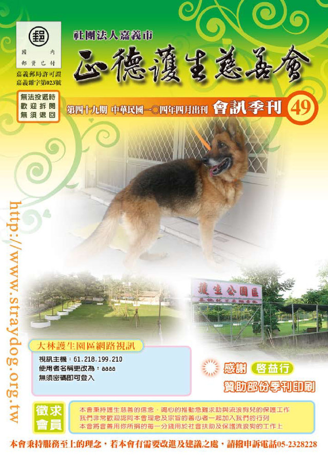 住址:嘉義市 案由: 案主因十二指腸潰瘍、酒精性肝 炎、痛風性關節炎等症,於12月底 入住加護病房,共計住院21天。醫 囑行動不變,無工作能力。案主有 雙手痛風性關節炎併痛風石,雙膝 痛風性關節炎併關節變形,長期為 病所苦,無法就業。案主之前並不 符合身心障礙資格審查,但目前醫 院願意開立殘障鑑定證明,希望可 通過公部門身心障礙資格審查案主 房屋為承租,因為與朋友合租,每 月分攤租金1500元。 本會長期補助3個月,每月2,000元、白米補 助6個月,每月2包 104/01-104/03、104/01- 104/06 戶號:742 江X壽 年齡60歲 住址:嘉義市 案由: 案主自述有心律不整、高血壓、C 型肝炎併肝硬化、腸胃潰瘍腰椎長 骨刺、雙腳尿酸痛風等症。但無上 述疾病相關醫師診斷證明。案主無 身心障礙手冊,自述無法工作。經 濟困難,三餐不繼。案主房屋為承 租,每月租金3000元,由牧師協助 代付一半。案主平日偶而撿回收變 賣度日。案主提出醫師診斷證明為 慢性肝炎及胰臟炎,屬服藥亦可控 制之症,其他病症無法確認。案主 長期依賴社福救助,本會補助案主 白米,協助案主生活。 本會長期補助6個月,每月白米2包 104/01- 104/06 ▪104年01月至03月急難救助戶 戶號:740 顏X娥 年齡57歲 住址:嘉義縣 案由: 案主罹患乳癌,因乳癌合併肺、肋 膜、肝與腦部多處轉移,於1/12日 104年01月至03月家扶戶:15,000元(共7位) 家扶補助戶 104年01月至03月白米戶:60包(共14戶) 童號 姓名 地區 補助金額 備註 2861 張X雯 嘉義縣 3000元 2882 丁X銓 雲林縣 1500元 3528 陳X璇 嘉義縣 1500元 3588 黃X瑋 嘉義市 3000元 3590 張X勝 嘉義市 1500元 3591 林X翔 嘉義縣 1500元 3657 李X翰 嘉義市 3000元 戶號 姓名 地區 補助包數 備註 051 徐X忠 嘉義縣 6包 724 孫X正 嘉義市 1包 104/01 725 黃X英 嘉義市 2包 104/01 726 陳X敏 嘉義市 6包 731 劉X為 嘉義市 9包 740 顏X娥 嘉義縣 3包 104/01 741 陳X桂 嘉義市 6包 742 江X壽 嘉義市 6包 743 楊X陸 嘉義市 4包 104/02-104/03 745 郭X聲 嘉義縣 2包 104/02 746 陳X伶 雲林縣 3包 104/03 747 王X傑 嘉義市 2包 104/03 748 朱X山 嘉義縣 6包 104/03 749 翁X捷 嘉義縣 4包 104/03 104年01月至03月狗隻領養明細 名稱/月份 1月 2月 3月 領養 4隻 18隻 10隻 餘額 1,193隻 1,210隻 1,183隻