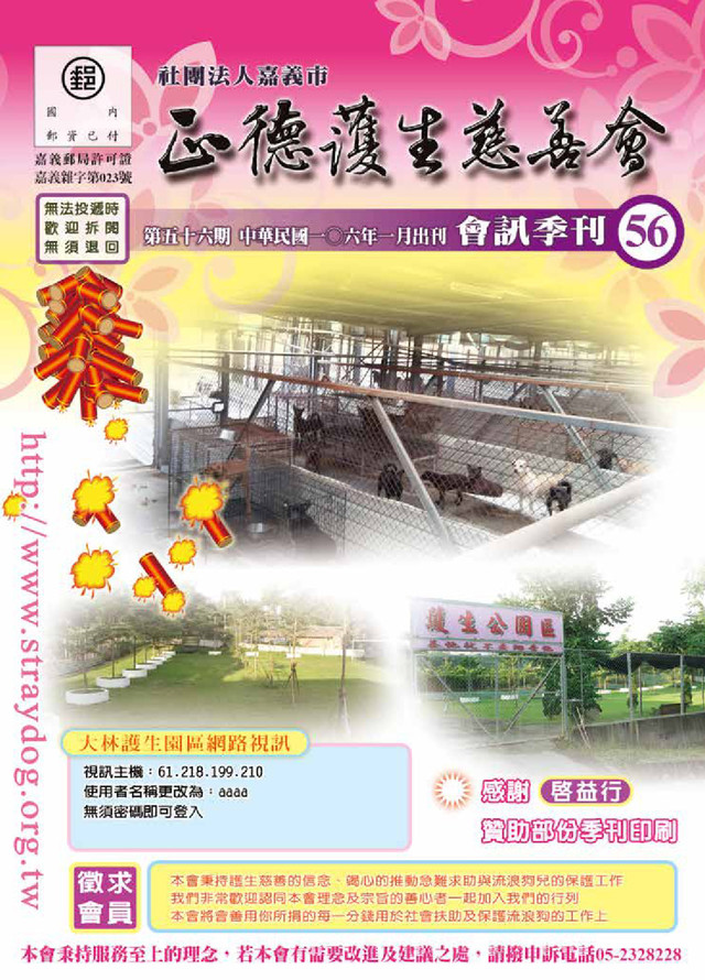 發行人:范進財 編輯:陳淑英 會址:嘉義市西區世賢路一段839號 電話:05-2911359 / 傳真:05-2313129 網址:http://www.straydog.org.tw 臉書:https://www.facebook.com/CYstraydogNPO 信箱: