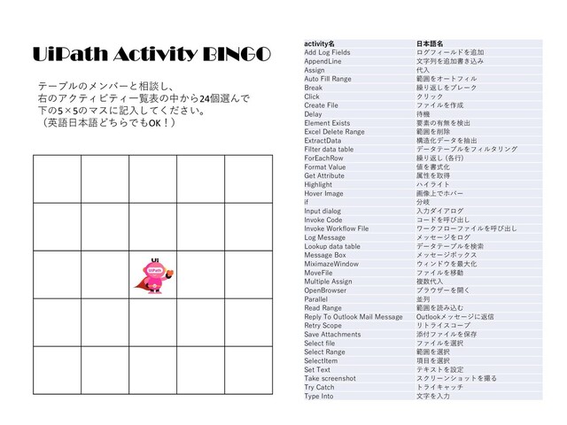 Auto Fill Range 範囲をオートフィル Break 繰り返しをブレーク Click クリック Create File ファイルを作成 Delay 待機 Element Exists 要素の有無を検出 Excel Delete Range 範囲を削除 ExtractData 構造化データを抽出 Filter data table データテーブルをフィルタリング ForEachRow 繰り返し (各行) Format Value 値を書式化 Get Attribute 属性を取得 Highlight ハイライト Hover Image 画像上でホバー if 分岐 Input dialog 入力ダイアログ Invoke Code コードを呼び出し Invoke Workflow File ワークフローファイルを呼び出し Log Message メッセージをログ Lookup data table データテーブルを検索 Message Box メッセージボックス MiximazeWindow ウィンドウを最大化 MoveFile ファイルを移動 Multiple Assign 複数代入 OpenBrowser ブラウザーを開く Parallel 並列 Read Range 範囲を読み込む Reply To Outlook Mail Message Outlookメッセージに返信 Retry Scope リトライスコープ Save Attachments 添付ファイルを保存 Select file ファイルを選択 Select Range 範囲を選択 SelectItem 項目を選択 Set Text テキストを設定 Take screenshot スクリーンショットを撮る Try Catch トライキャッチ Type Into 文字を入力 UiPath Activity BINGO テーブルのメンバーと相談し、 右のアクティビティ一覧表の中から24個選んで 下の5×5のマスに記入してください。 (英語日本語どちらでもOK!)