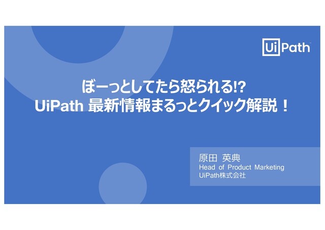 ぼーっとしてたら怒られる!? UiPath 最新情報まるっとクイック解説︕ 原⽥ 英典 Head of Product Marketing UiPath株式会社