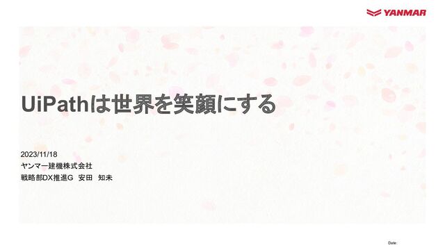 Date: 2023/11/18 ヤンマー建機株式会社 戦略部DX推進G 安田 知未 UiPathは世界を笑顔にする
