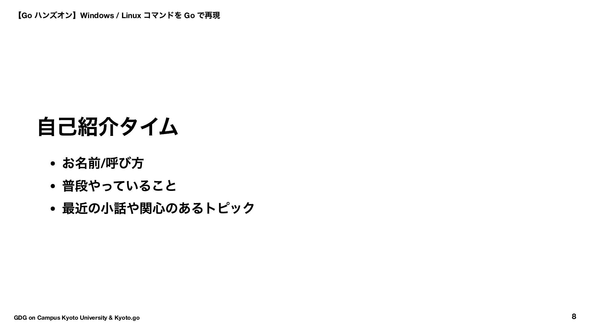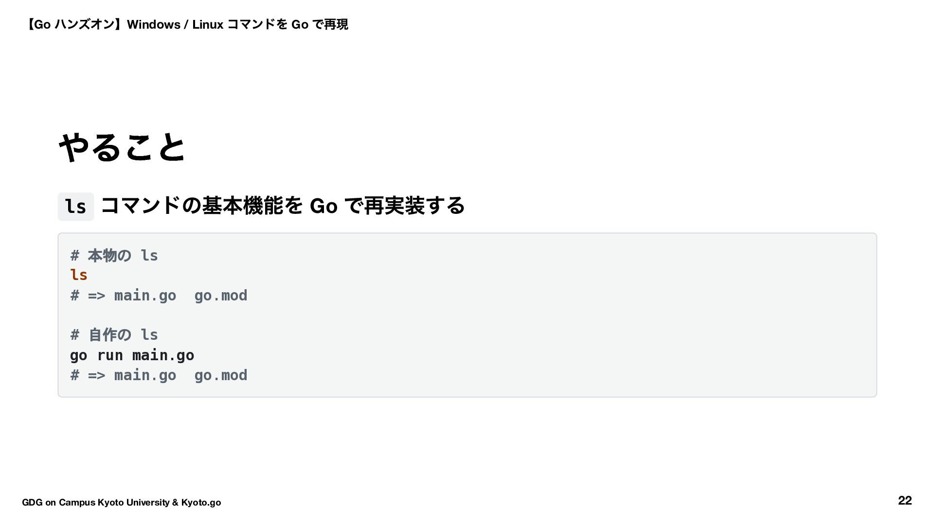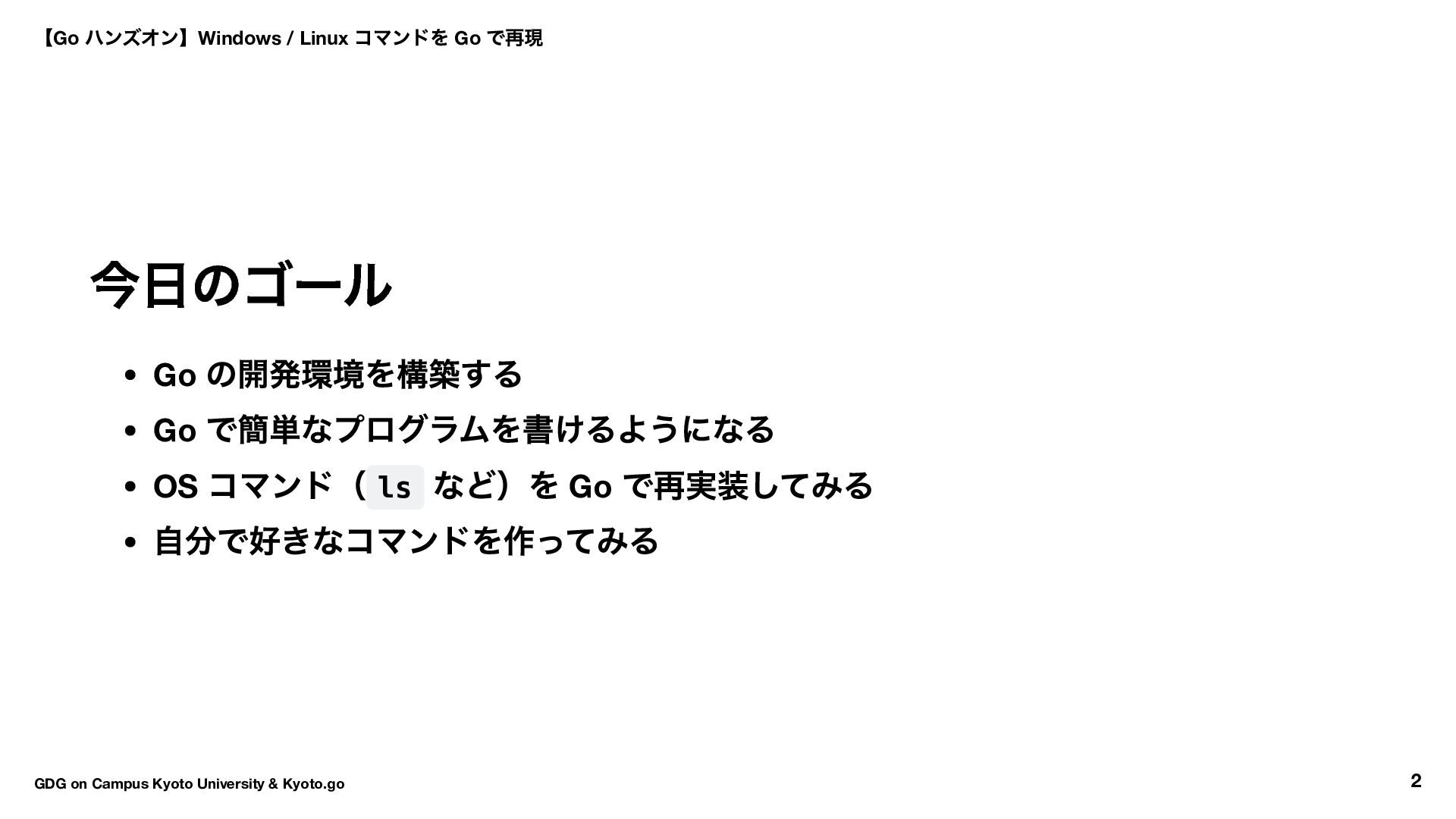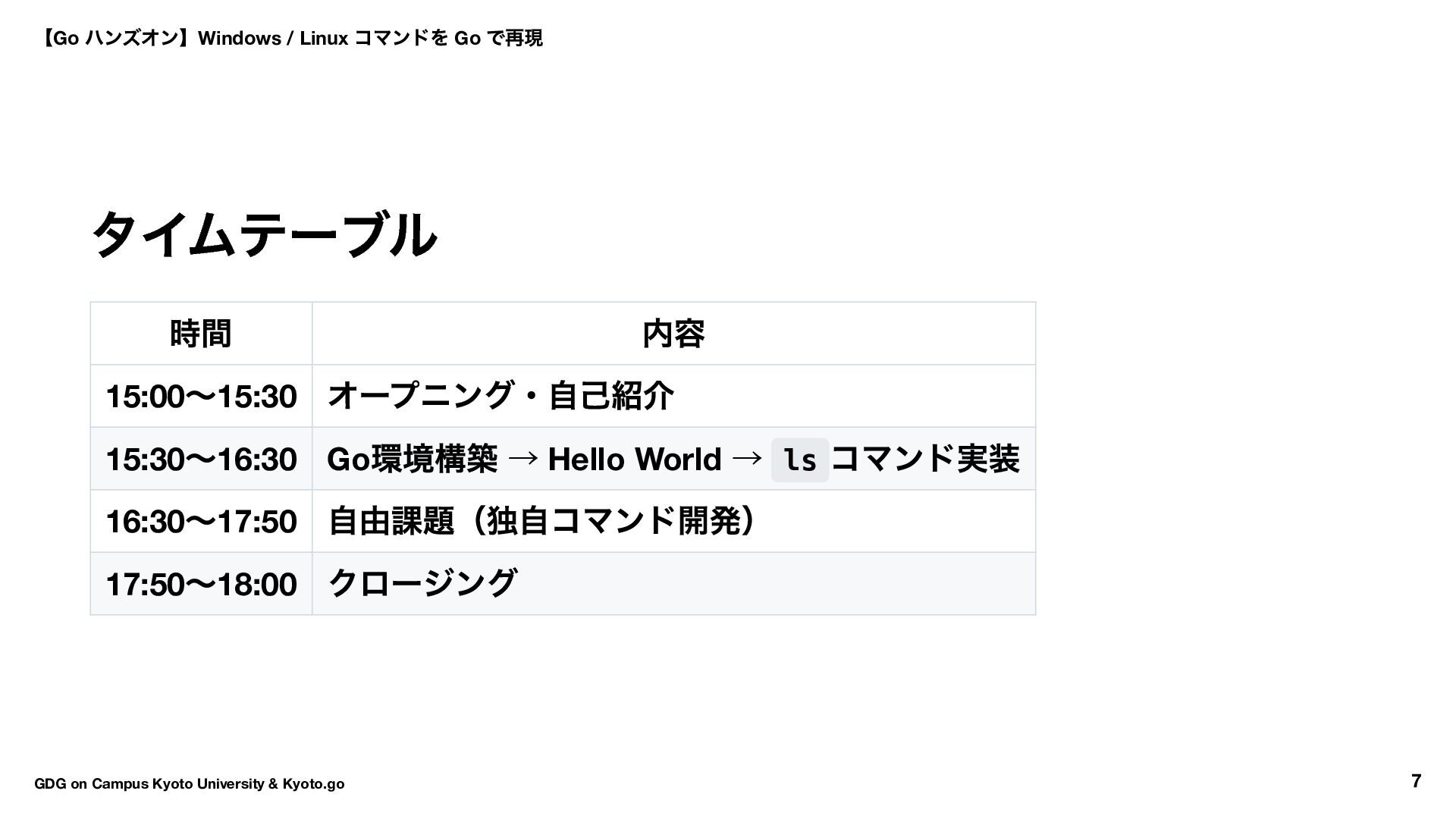 → Hello World → ls コマンド実装 16:30 〜17:50 自由課題(独自コマンド開発) 17:50 〜18:00 クロージング 【Go ハンズオン】Windows / Linux コマンドを Go で再現 GDG on Campus Kyoto University & Kyoto.go 7