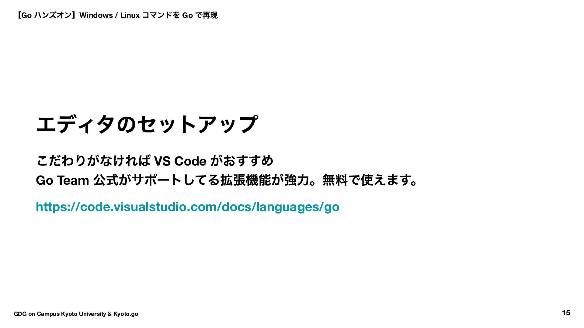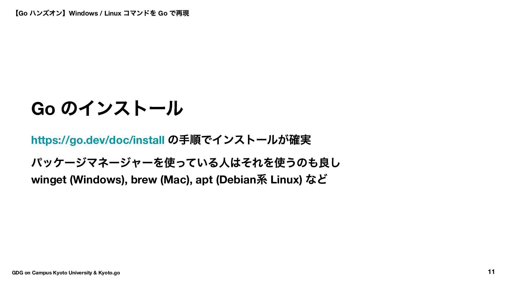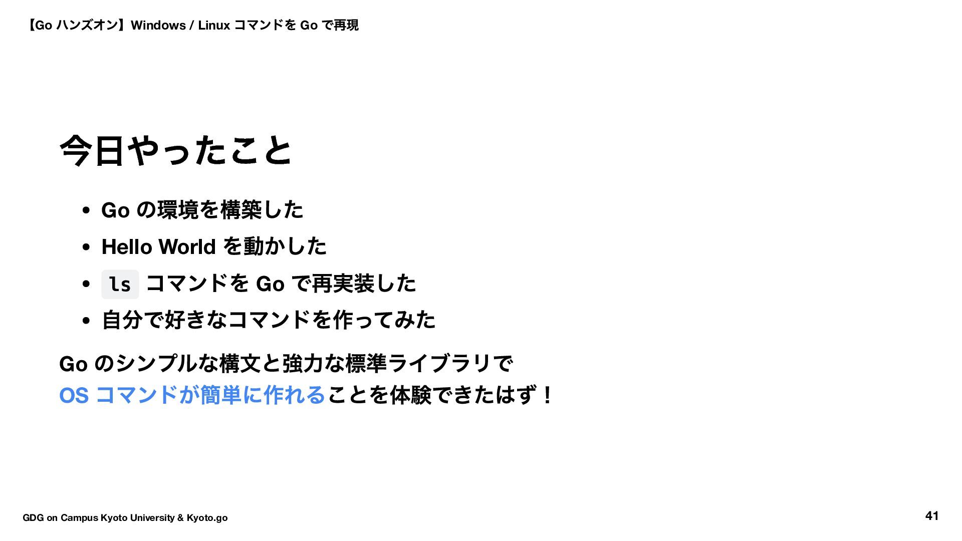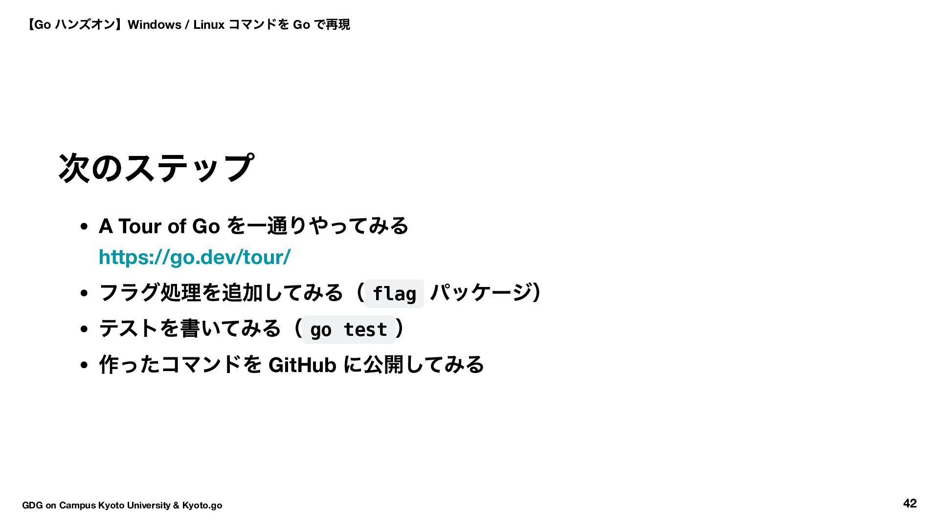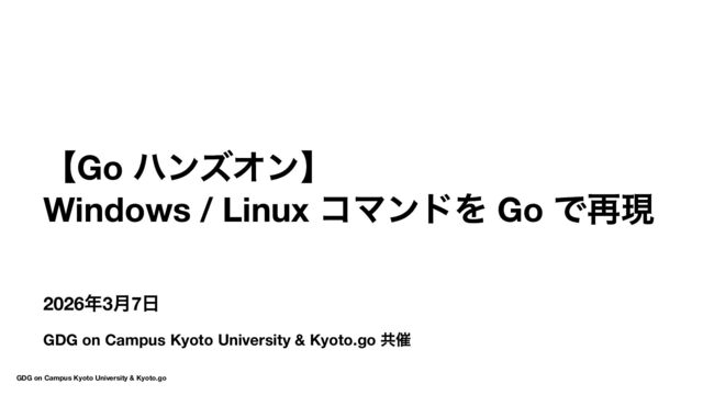 → Hello World → ls コマンド実装 16:30 〜17:50 自由課題(独自コマンド開発) 17:50 〜18:00 クロージング 【Go ハンズオン】Windows / Linux コマンドを Go で再現 GDG on Campus Kyoto University & Kyoto.go 7