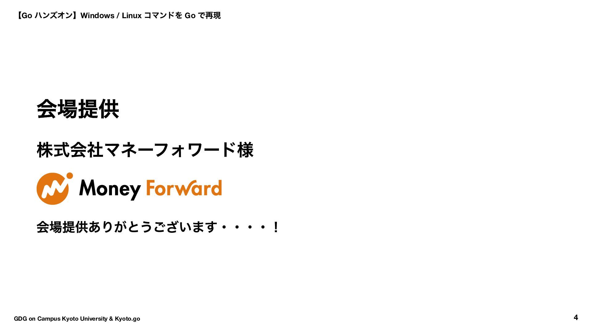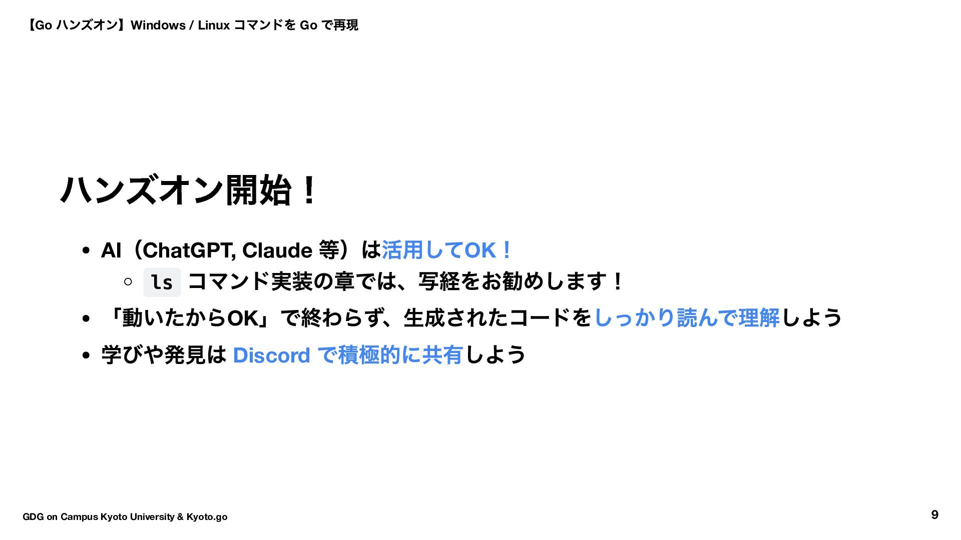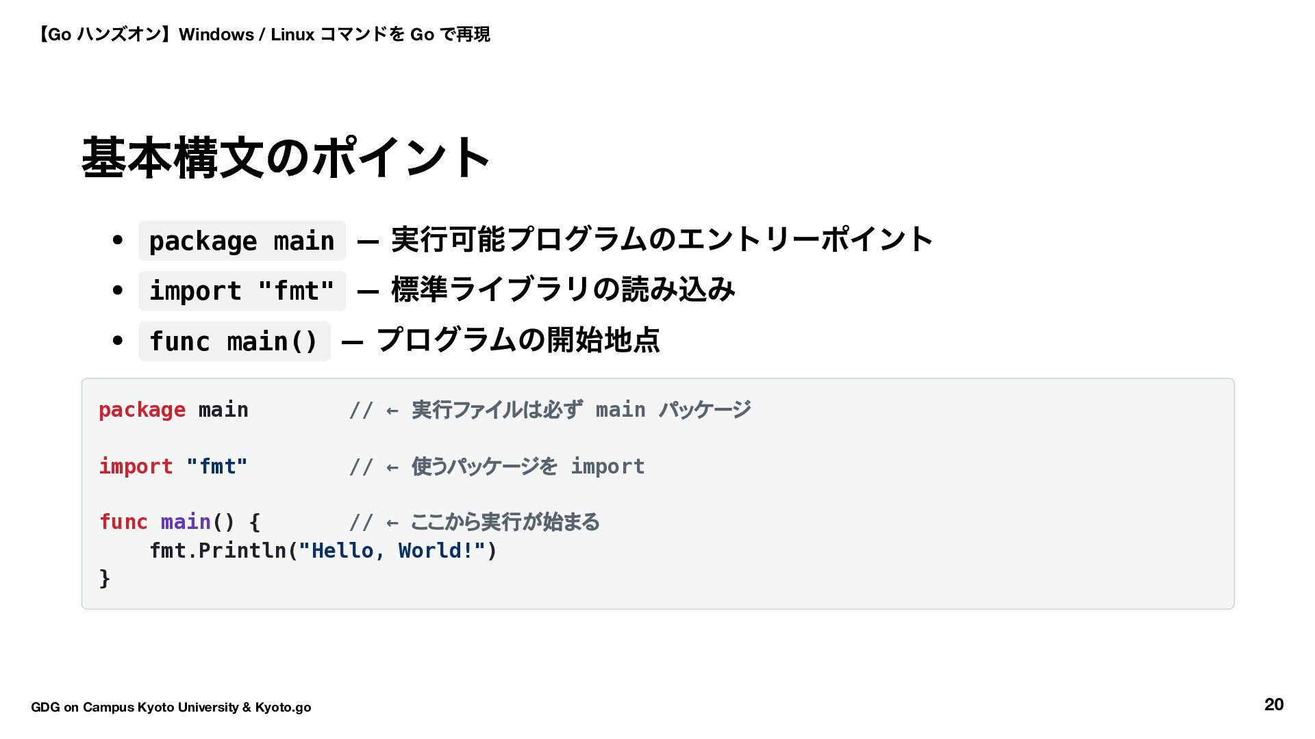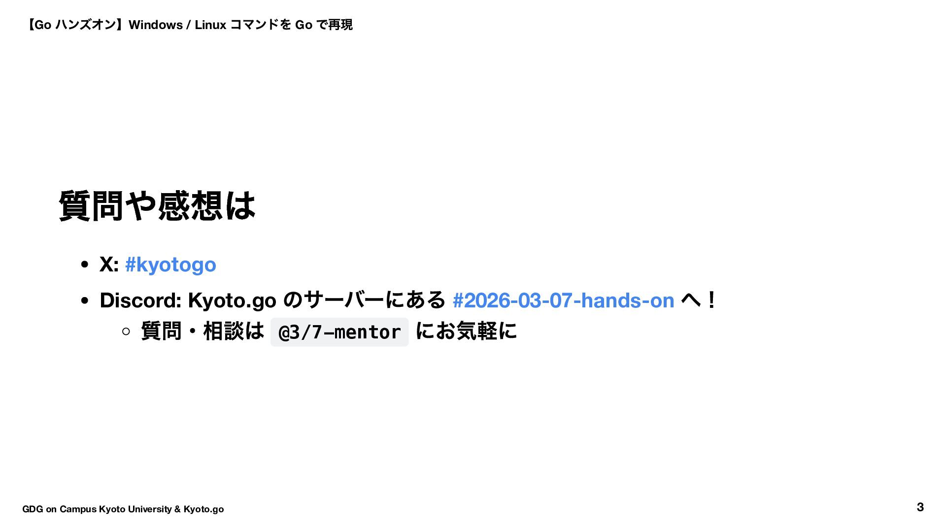 → Hello World → ls コマンド実装 16:30 〜17:50 自由課題(独自コマンド開発) 17:50 〜18:00 クロージング 【Go ハンズオン】Windows / Linux コマンドを Go で再現 GDG on Campus Kyoto University & Kyoto.go 7