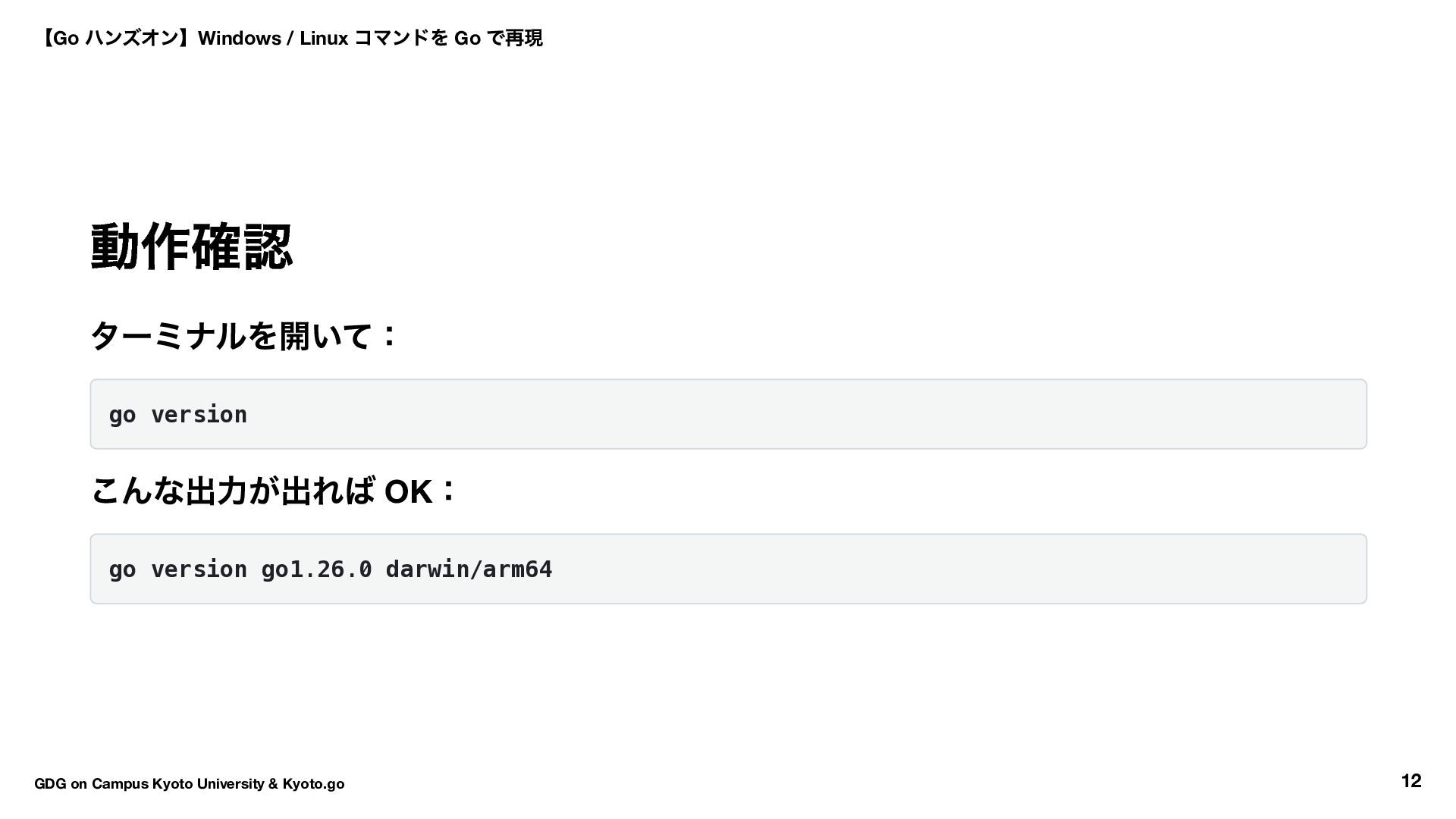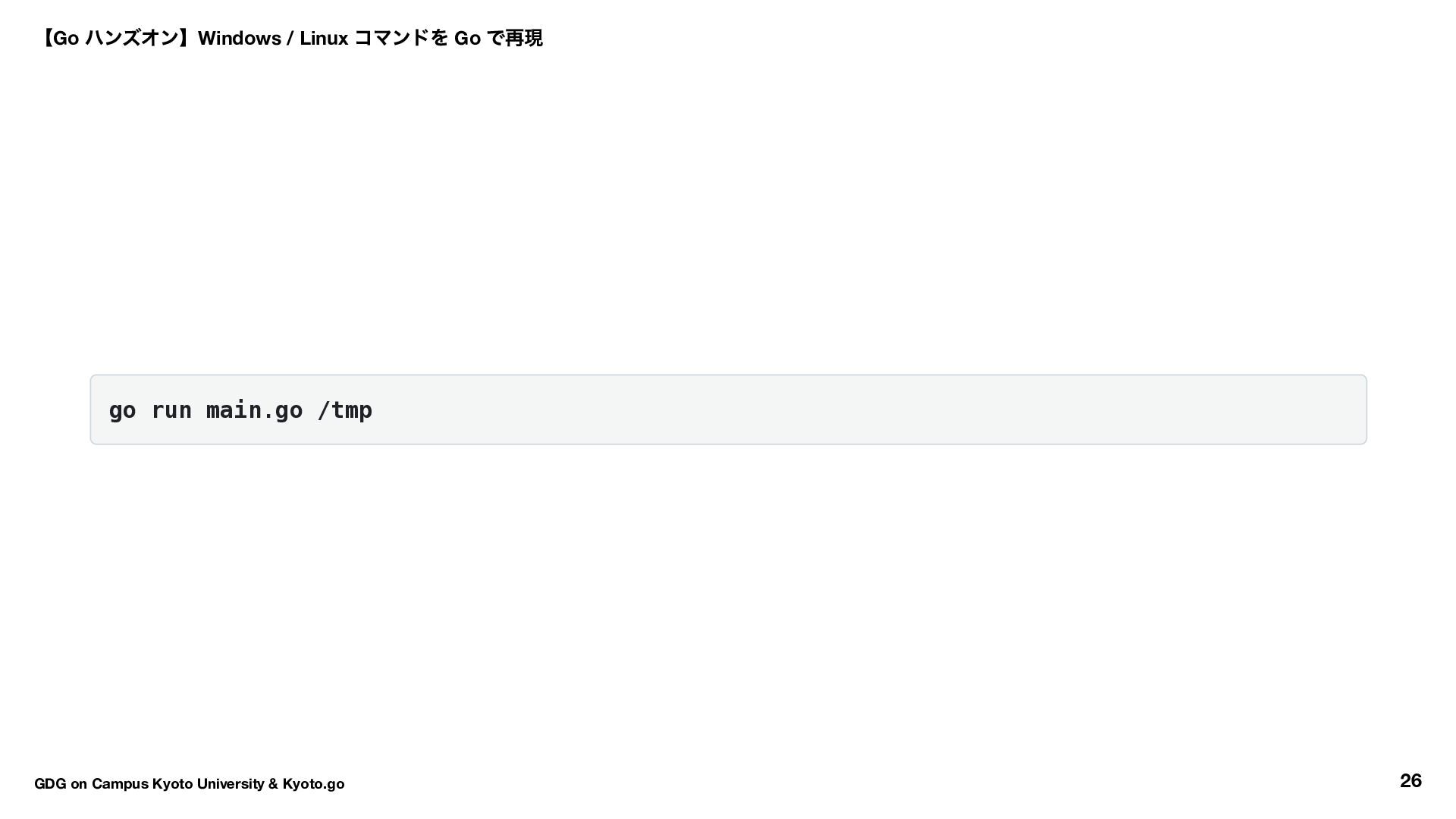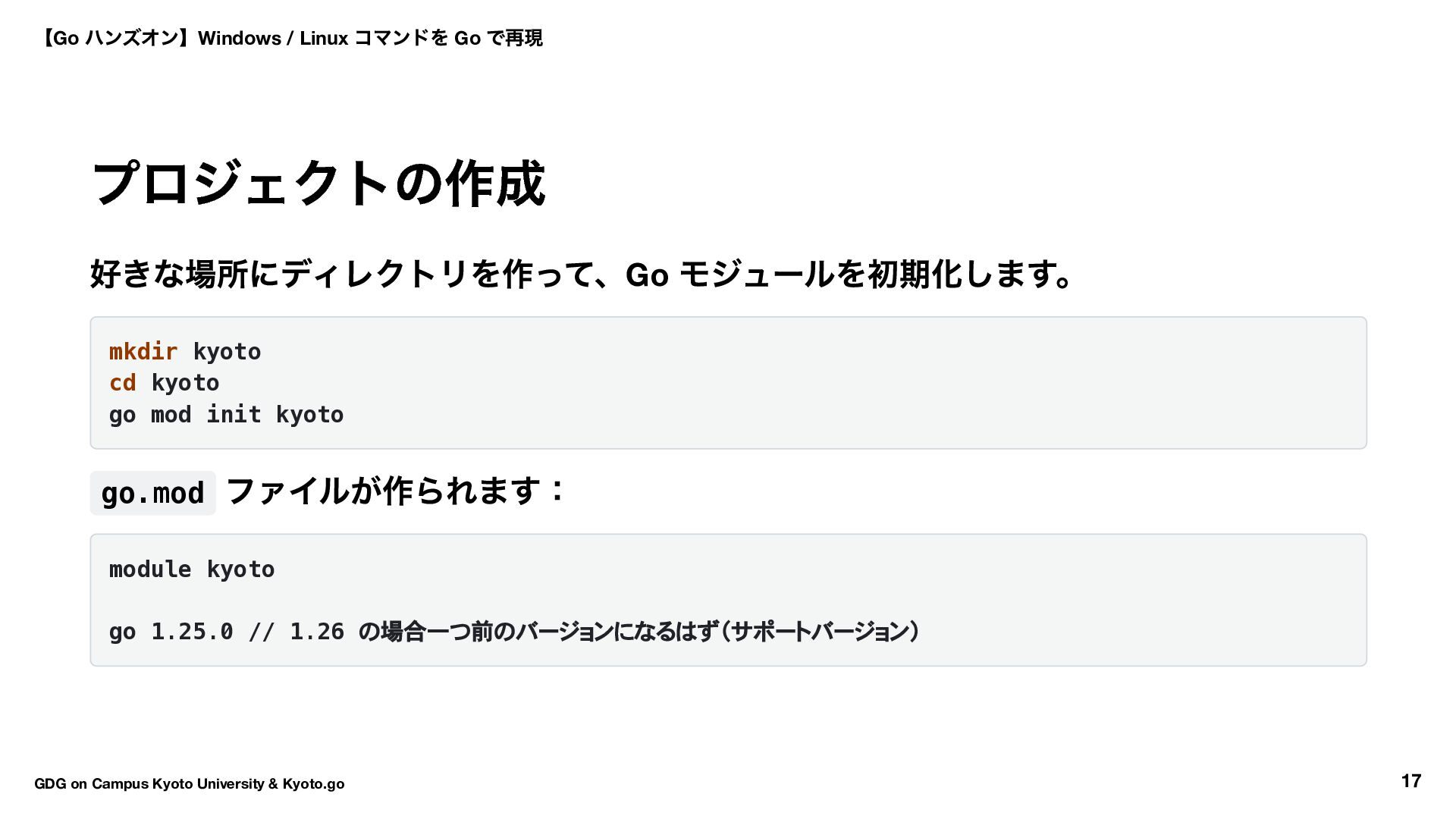 kyoto go.mod ファイルが作られます: module kyoto go 1.25.0 // 1.26 の場合一つ前のバージョンになるはず(サポートバージョン) 【Go ハンズオン】Windows / Linux コマンドを Go で再現 GDG on Campus Kyoto University & Kyoto.go 17