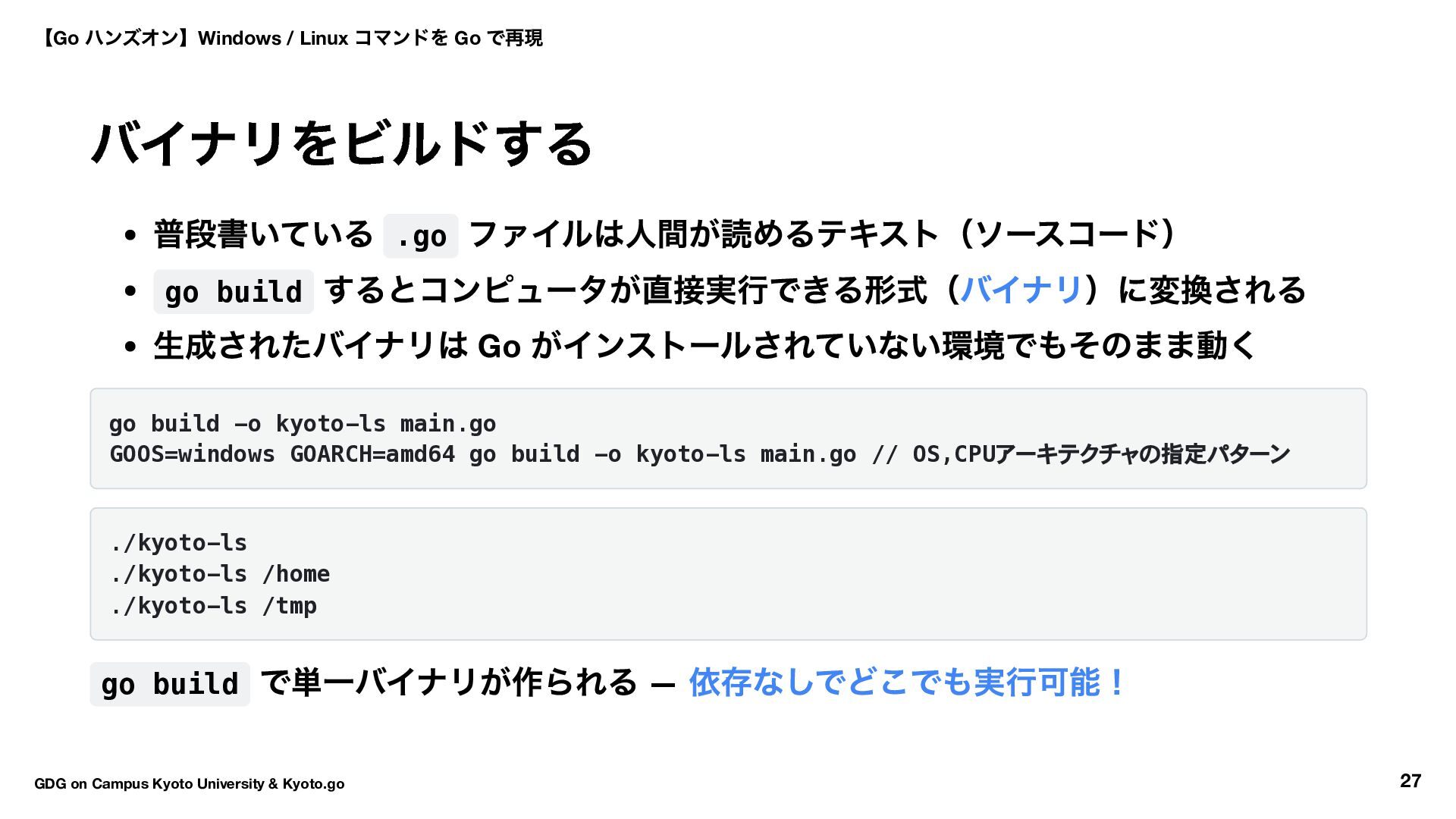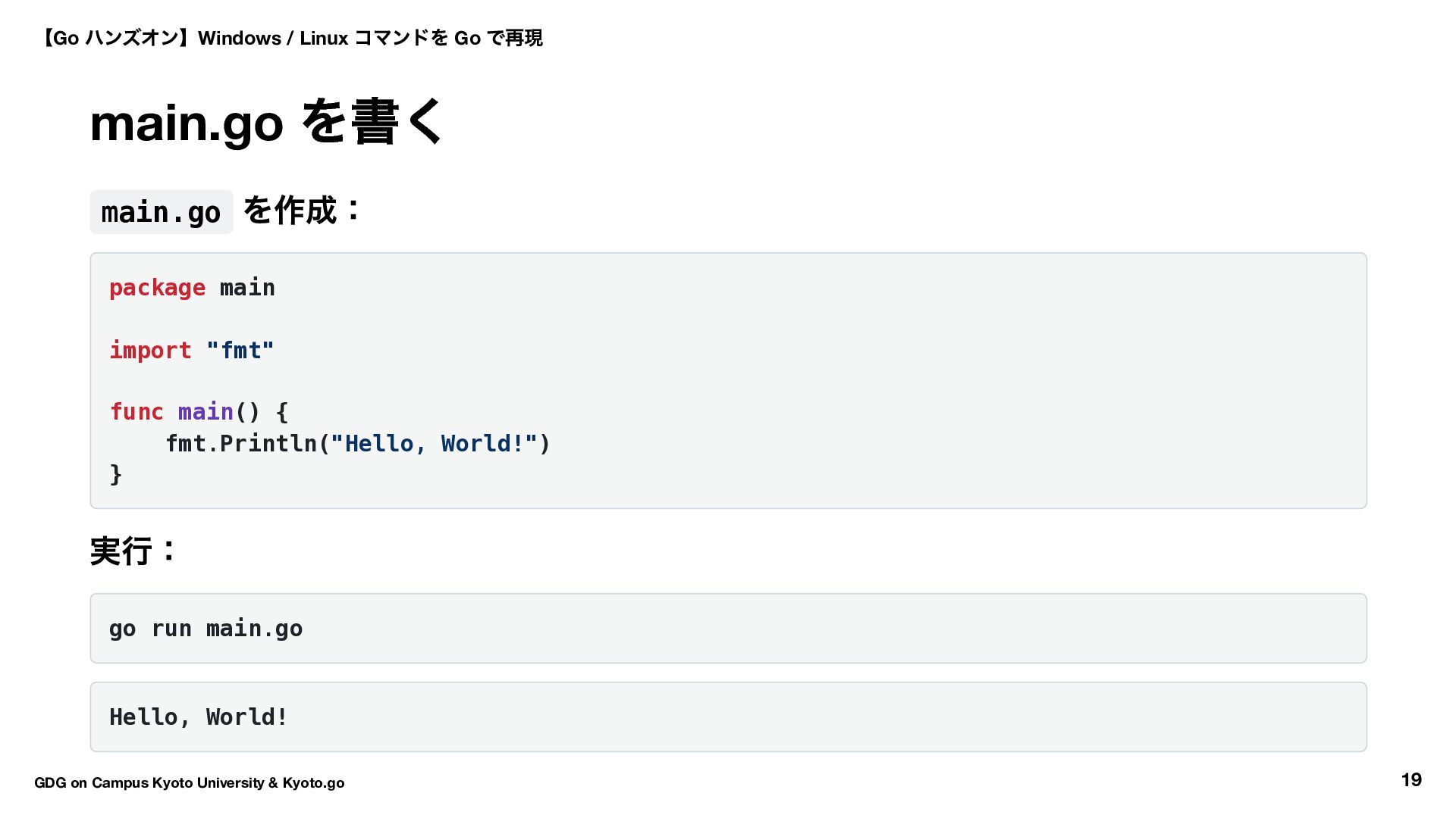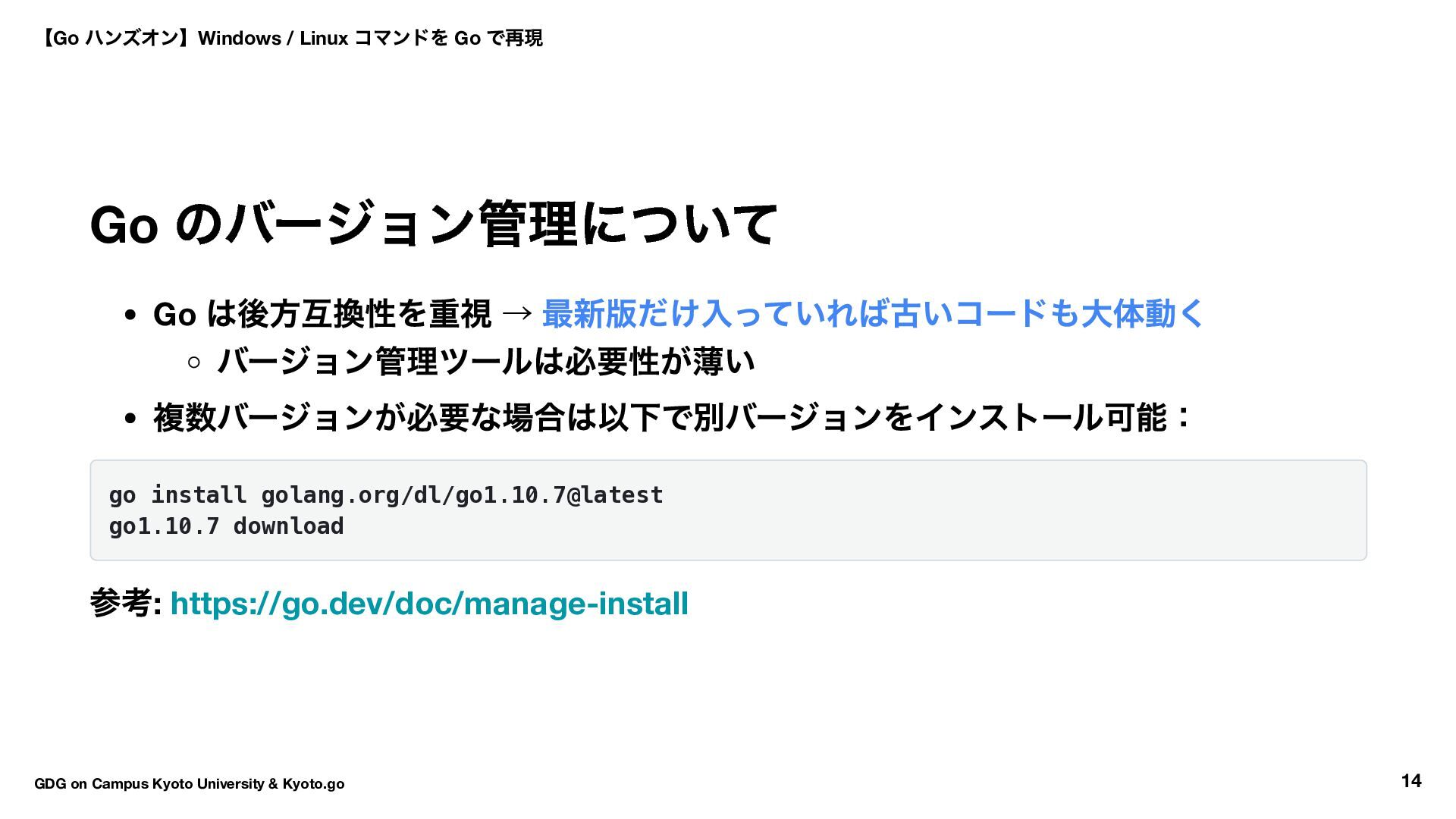 kyoto go.mod ファイルが作られます: module kyoto go 1.25.0 // 1.26 の場合一つ前のバージョンになるはず(サポートバージョン) 【Go ハンズオン】Windows / Linux コマンドを Go で再現 GDG on Campus Kyoto University & Kyoto.go 17