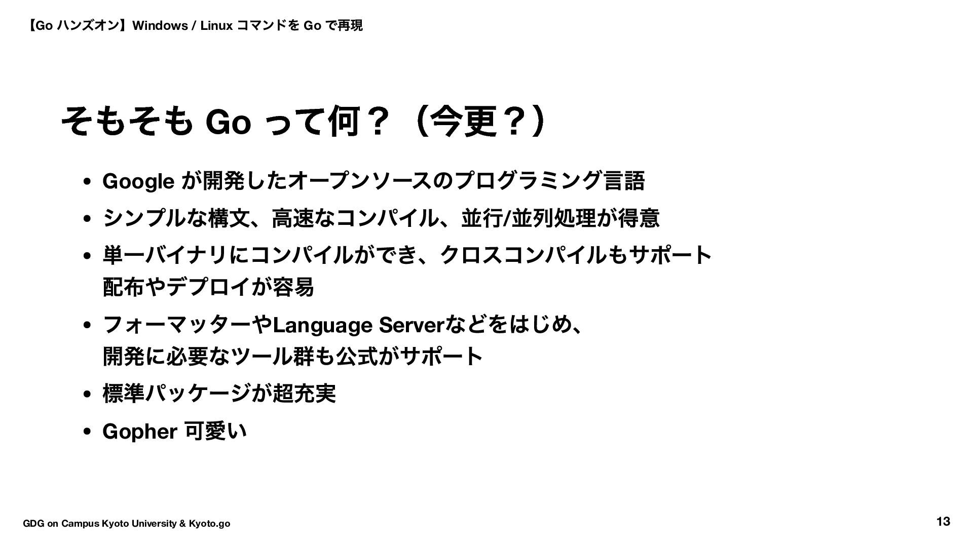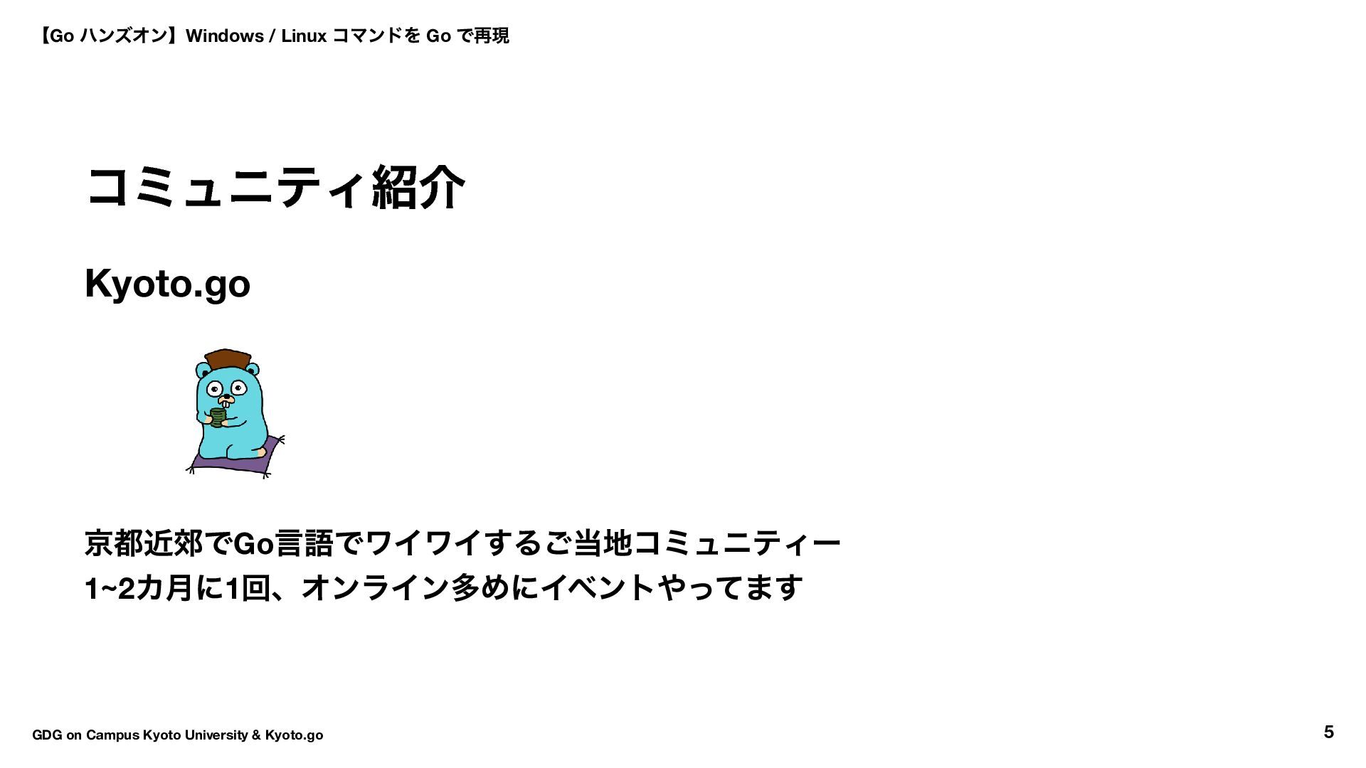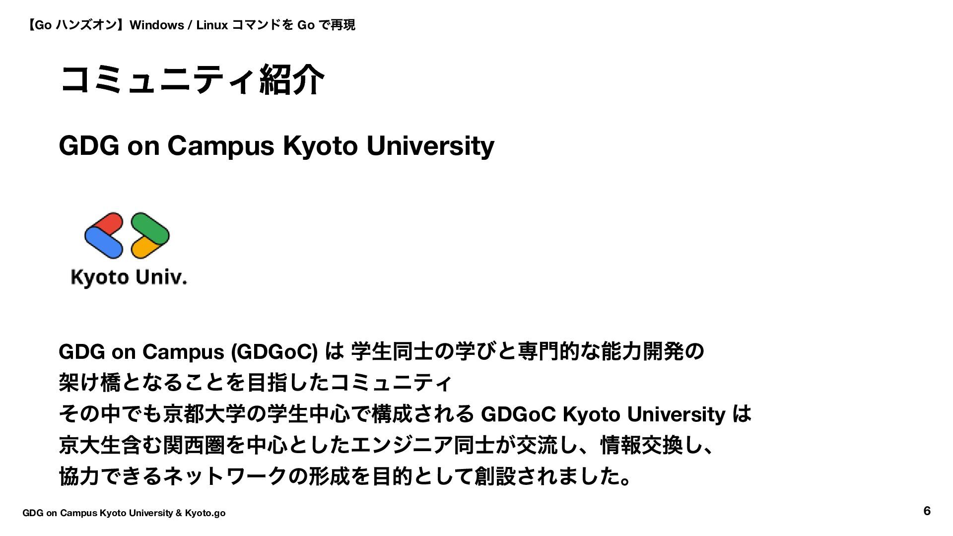 は 学生同士の学びと専門的な能力開発の 架け橋となることを目指したコミュニティ その中でも京都大学の学生中心で構成される GDGoC Kyoto University は 京大生含む関西圏を中心としたエンジニア同士が交流し、情報交換し、 協力できるネットワークの形成を目的として創設されました。 【Go ハンズオン】Windows / Linux コマンドを Go で再現 GDG on Campus Kyoto University & Kyoto.go 6