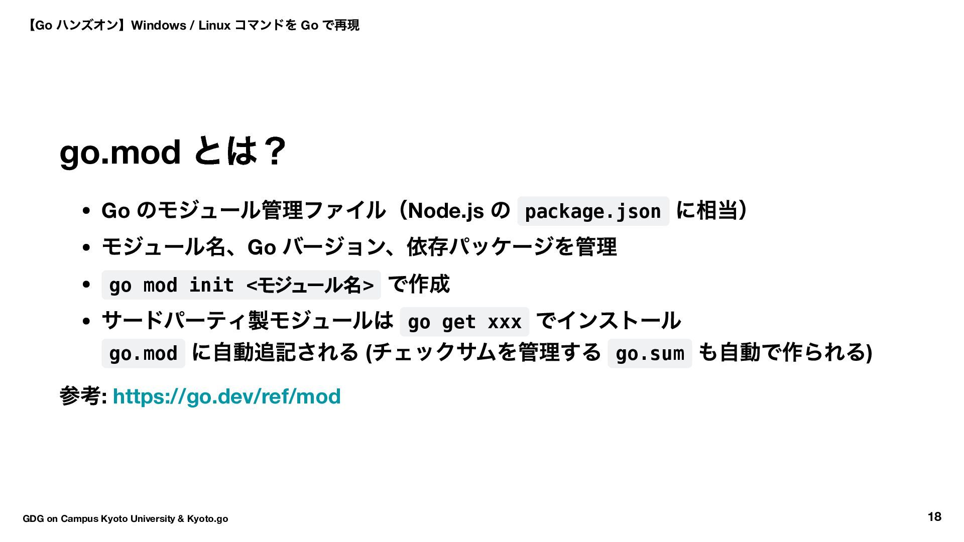 mod init <モジュール名> で作成 サードパーティ製モジュールは go get xxx でインストール go.mod に自動追記される ( チェックサムを管理する go.sum も自動で作られる) 参考: https://go.dev/ref/mod 【Go ハンズオン】Windows / Linux コマンドを Go で再現 GDG on Campus Kyoto University & Kyoto.go 18