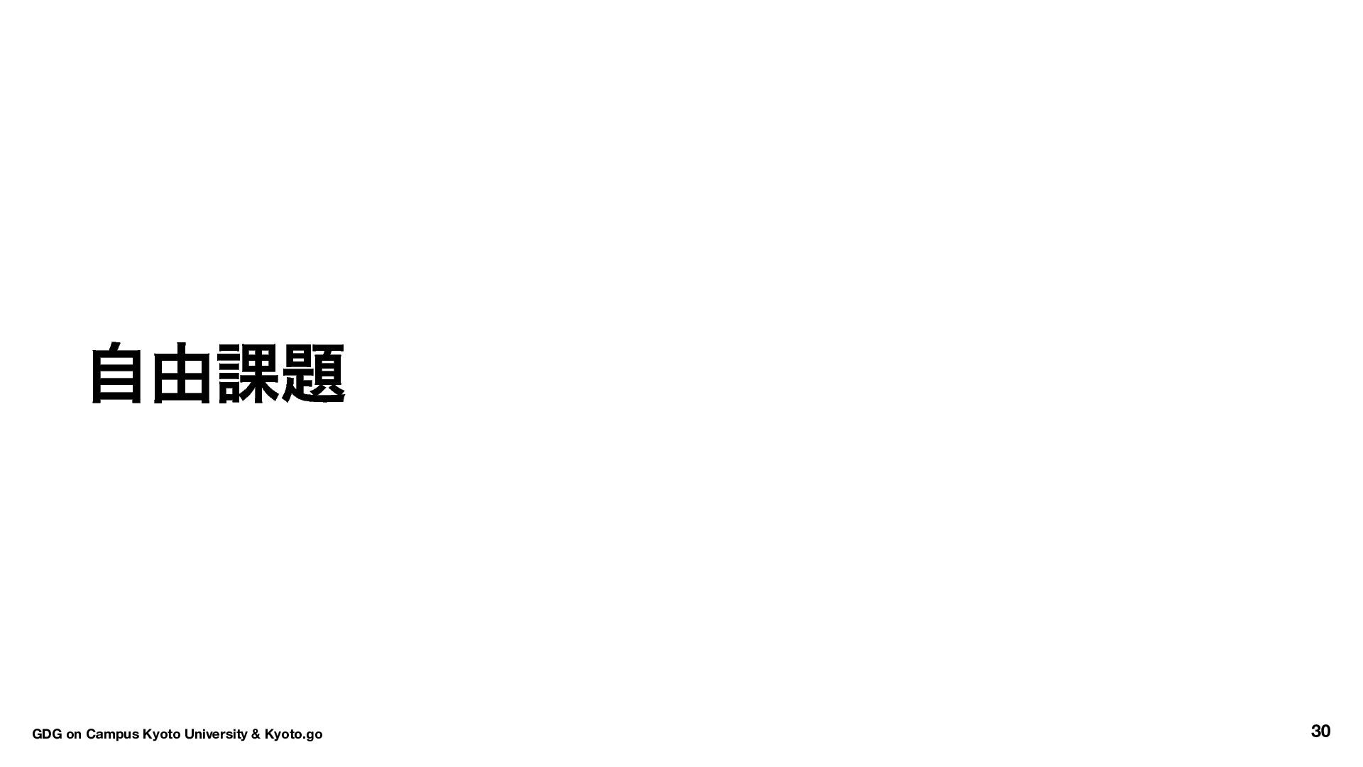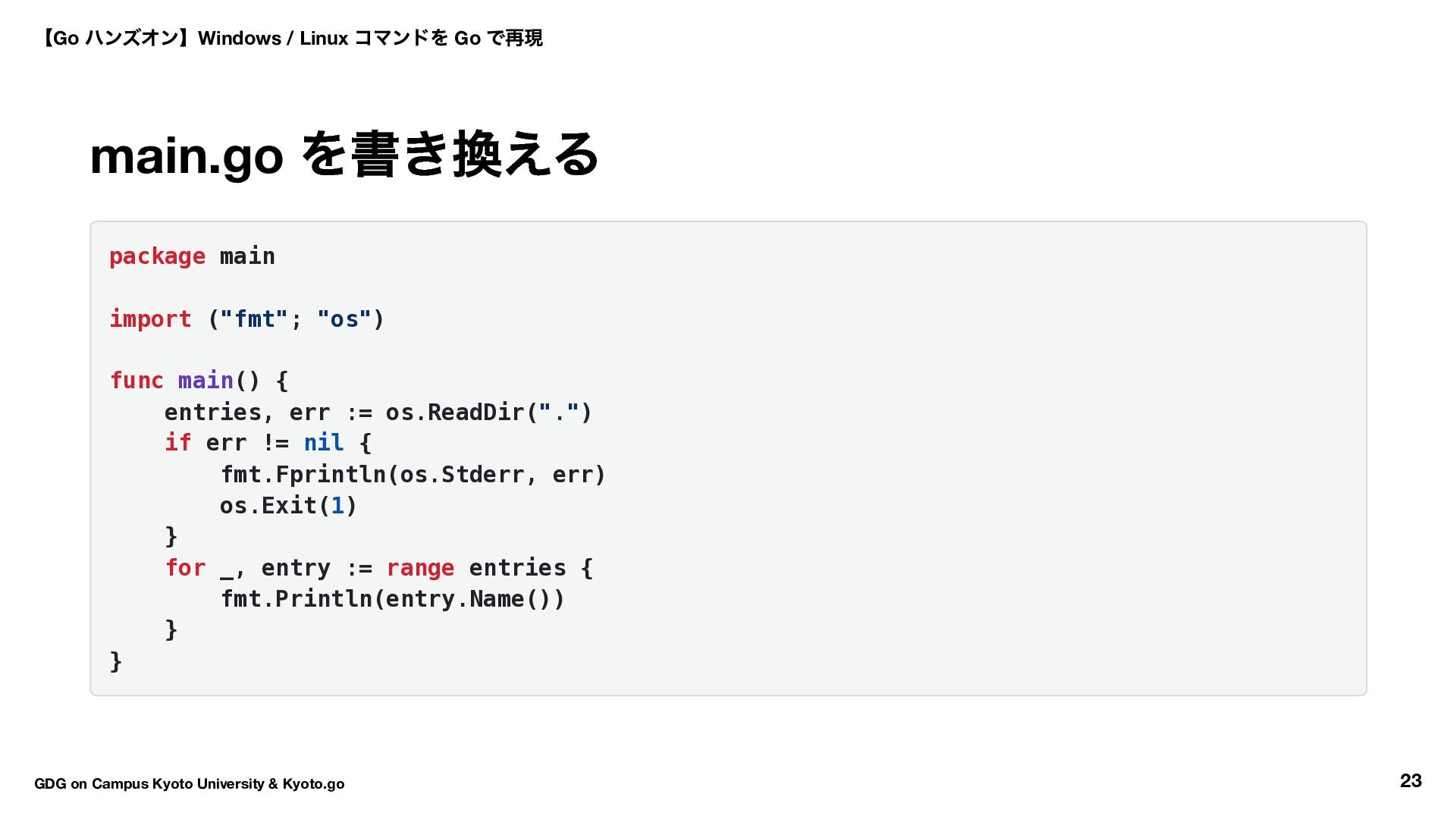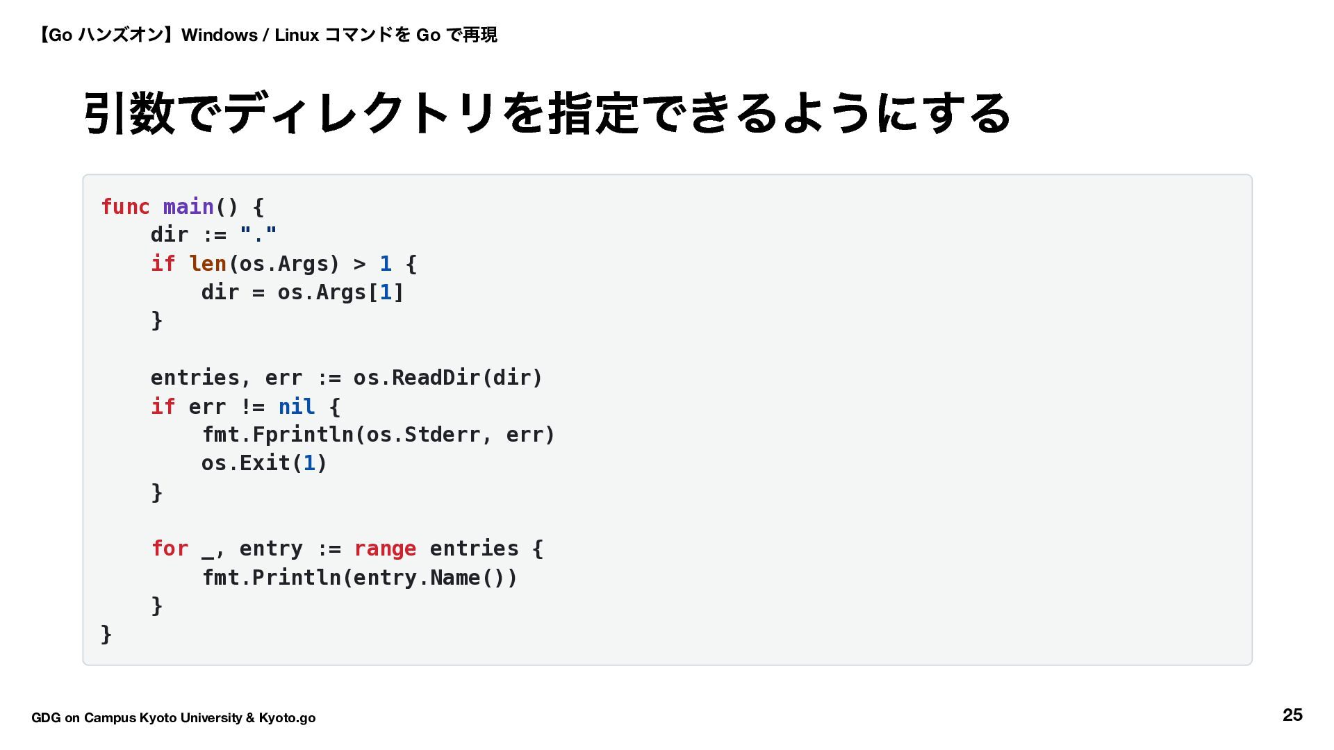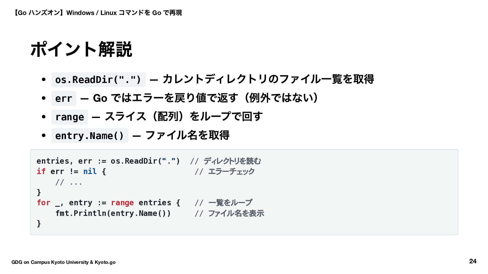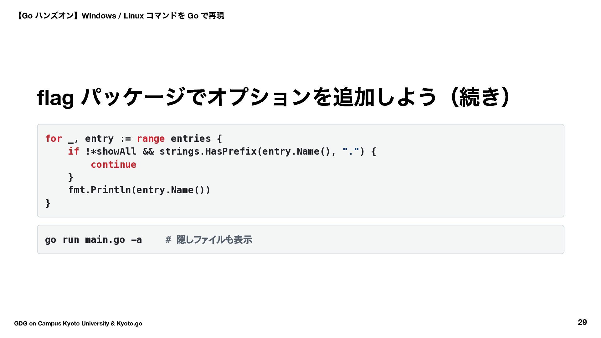 !*showAll && strings.HasPrefix(entry.Name(), ".") { continue } fmt.Println(entry.Name()) } go run main.go -a # 隠しファイルも表示 【Go ハンズオン】Windows / Linux コマンドを Go で再現 GDG on Campus Kyoto University & Kyoto.go 29