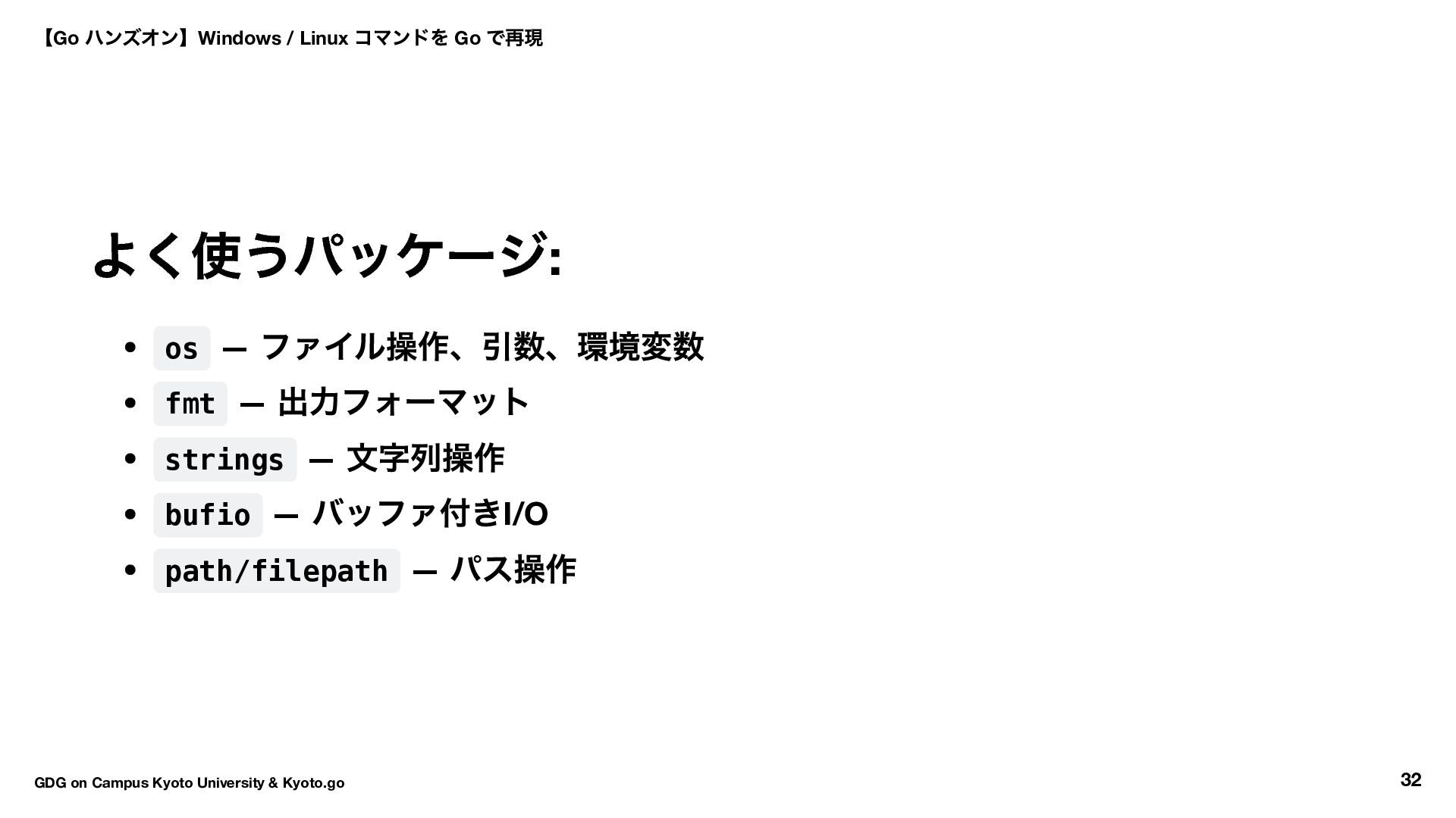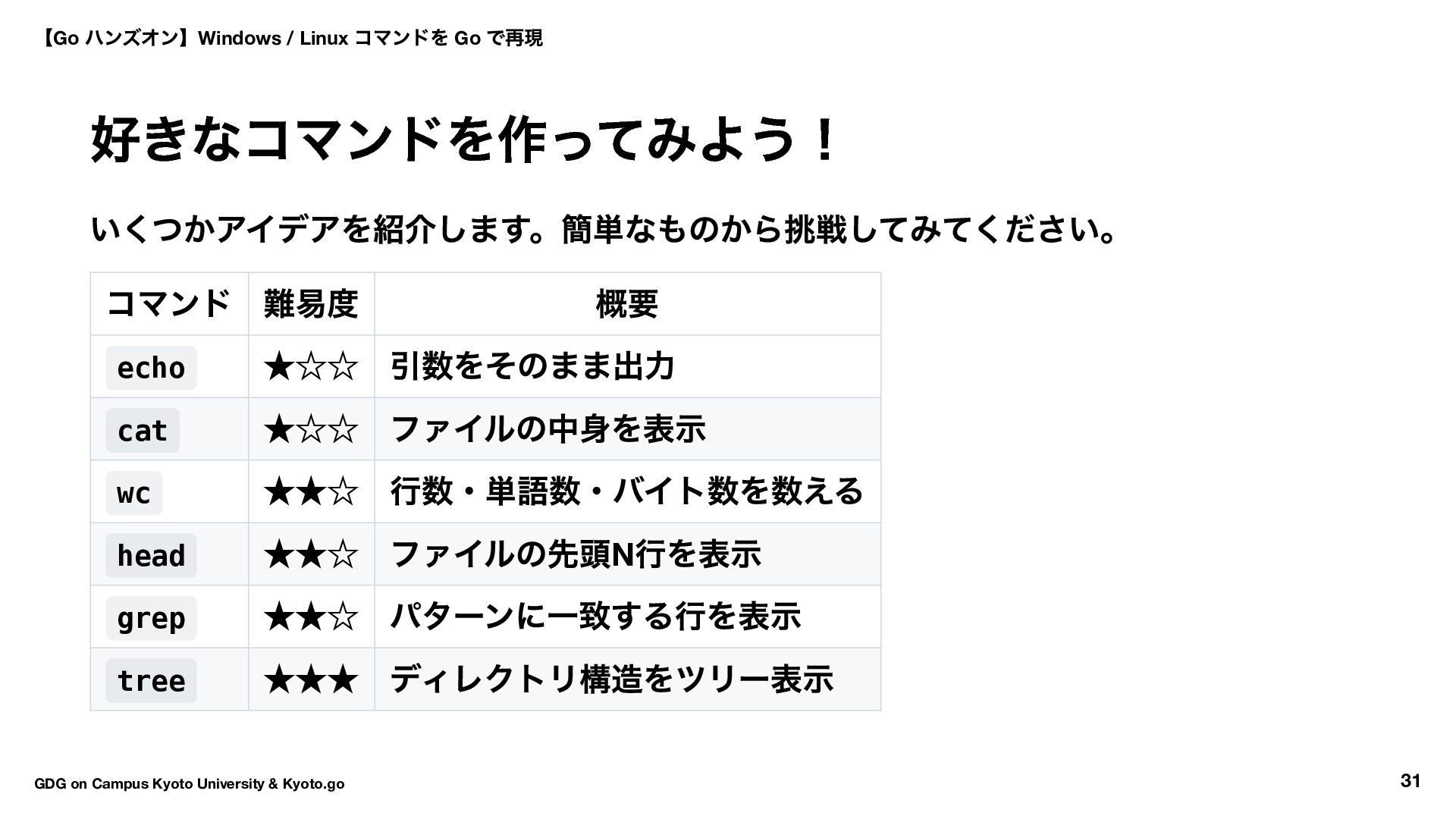 ファイルの中身を表示 wc ★★☆ 行数・単語数・バイト数を数える head ★★☆ ファイルの先頭N 行を表示 grep ★★☆ パターンに一致する行を表示 tree ★★★ ディレクトリ構造をツリー表示 【Go ハンズオン】Windows / Linux コマンドを Go で再現 GDG on Campus Kyoto University & Kyoto.go 31