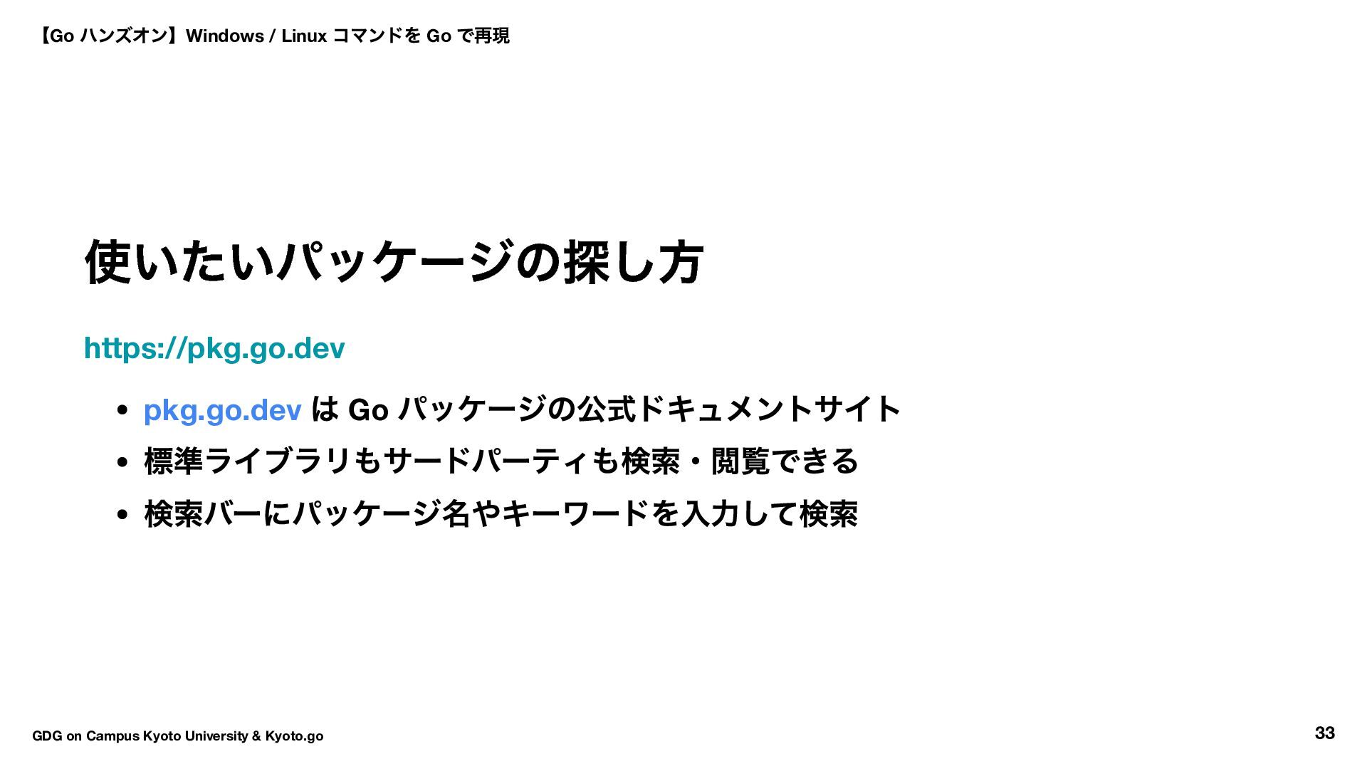 変数、ループ、関数、構造体、インターフェースなど一通りカバー Go Playground で気軽に試せる! https://go.dev/play/ ブラウザだけで Go のコードを書いて即実行できる 環境構築不要、ちょっとした動作確認に便利 【Go ハンズオン】Windows / Linux コマンドを Go で再現 GDG on Campus Kyoto University & Kyoto.go 34
