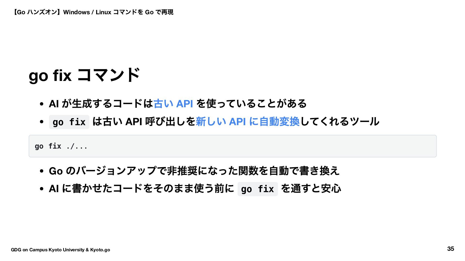 API 呼び出しを新しい API に自動変換してくれるツール go fix ./... Go のバージョンアップで非推奨になった関数を自動で書き換え AI に書かせたコードをそのまま使う前に go fix を通すと安心 【Go ハンズオン】Windows / Linux コマンドを Go で再現 GDG on Campus Kyoto University & Kyoto.go 35
