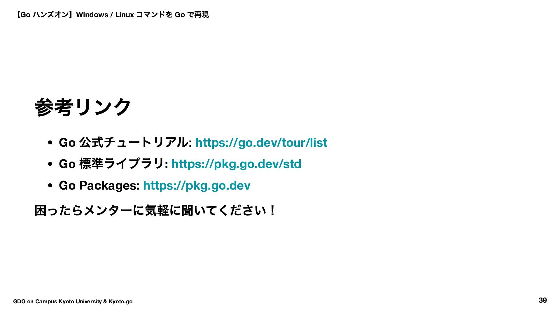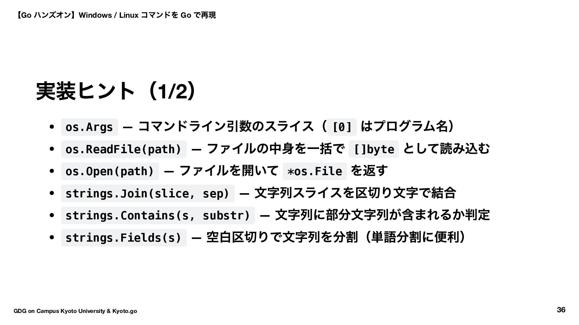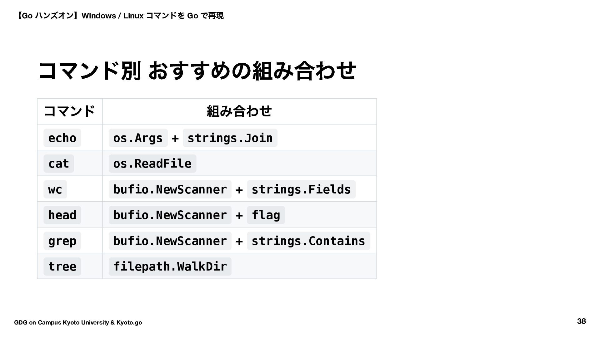 wc bufio.NewScanner + strings.Fields head bufio.NewScanner + flag grep bufio.NewScanner + strings.Contains tree filepath.WalkDir 【Go ハンズオン】Windows / Linux コマンドを Go で再現 GDG on Campus Kyoto University & Kyoto.go 38