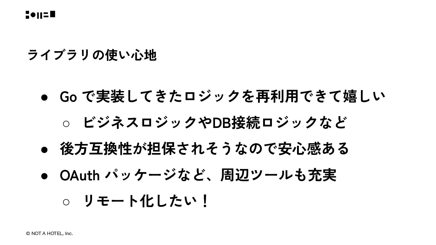 © NOT A HOTEL, Inc. • Go で実装してきたロジックを再利用できて嬉しい ◦ ビジネスロジックやDB接続ロジックなど