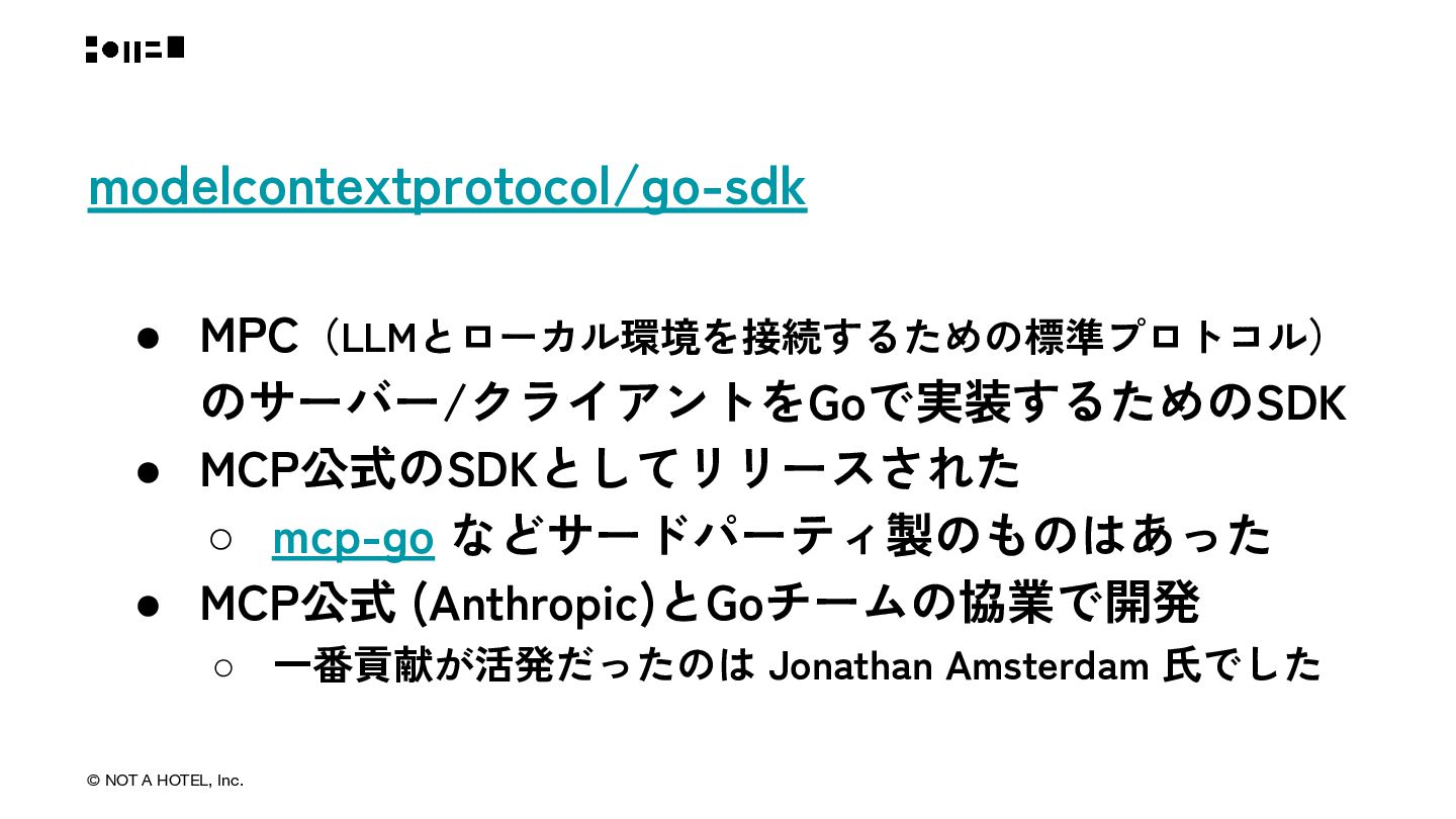 © NOT A HOTEL, Inc. modelcontextprotocol/go-sdk • MPC(LLMとローカル環境を接続するための標準プロトコル) のサーバー/クライアントをGoで実装するためのSDK •
