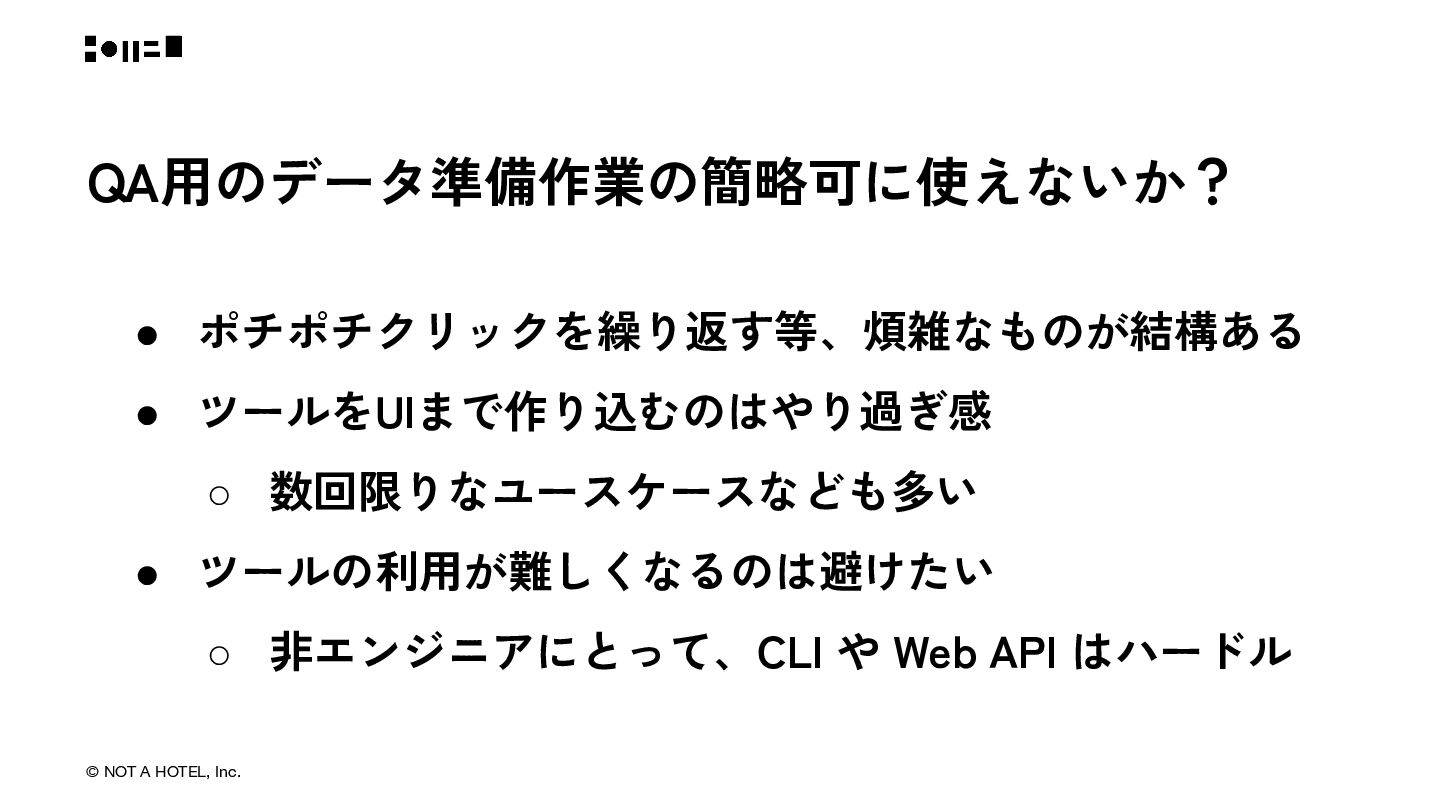 © NOT A HOTEL, Inc. QA用のデータ準備作業の簡略可に使えないか? • ポチポチクリックを繰り返す等、煩雑なものが結構ある • ツールをUIまで作り込むのはやり過ぎ感