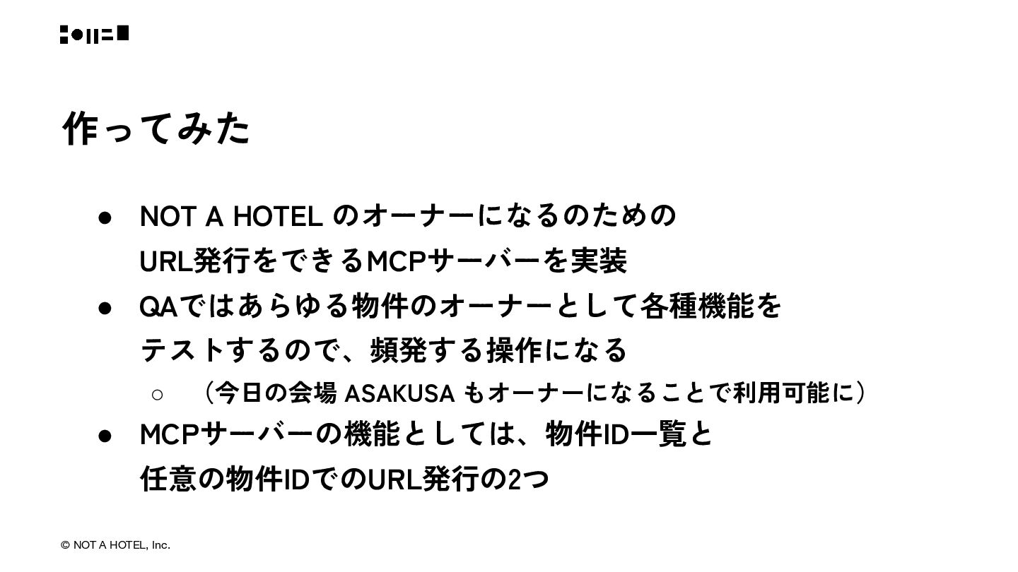 URL発行をできるMCPサーバーを実装 • QAではあらゆる物件のオーナーとして各種機能を テストするので、頻発する操作になる ◦ (今日の会場 ASAKUSA もオーナーになることで利用可能に) • MCPサーバーの機能としては、物件ID一覧と 任意の物件IDでのURL発行の2つ 作ってみた