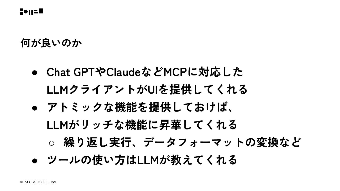 © NOT A HOTEL, Inc. 何が良いのか • Chat GPTやClaudeなどMCPに対応した LLMクライアントがUIを提供してくれる