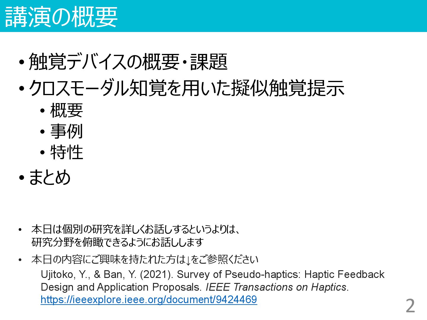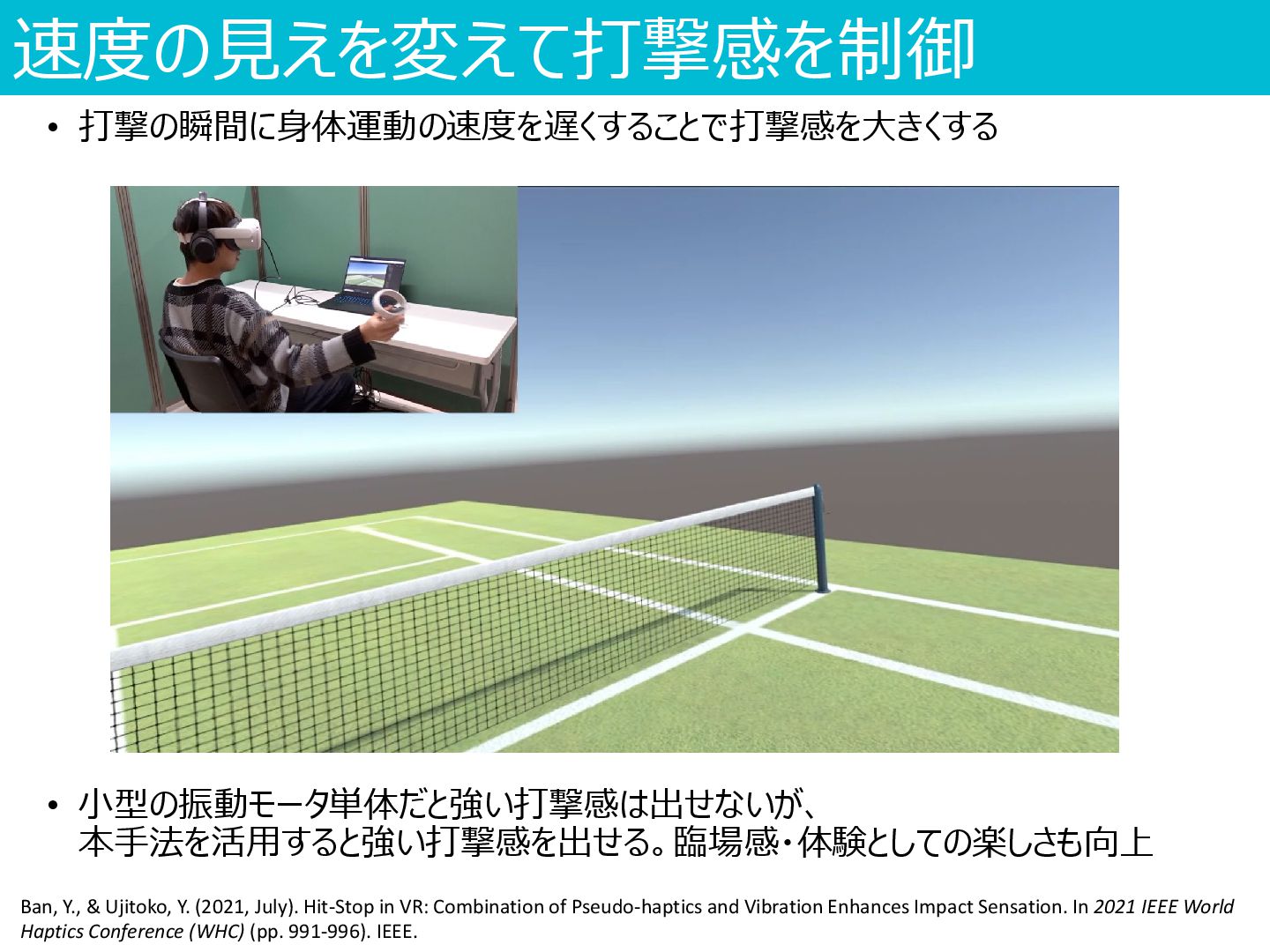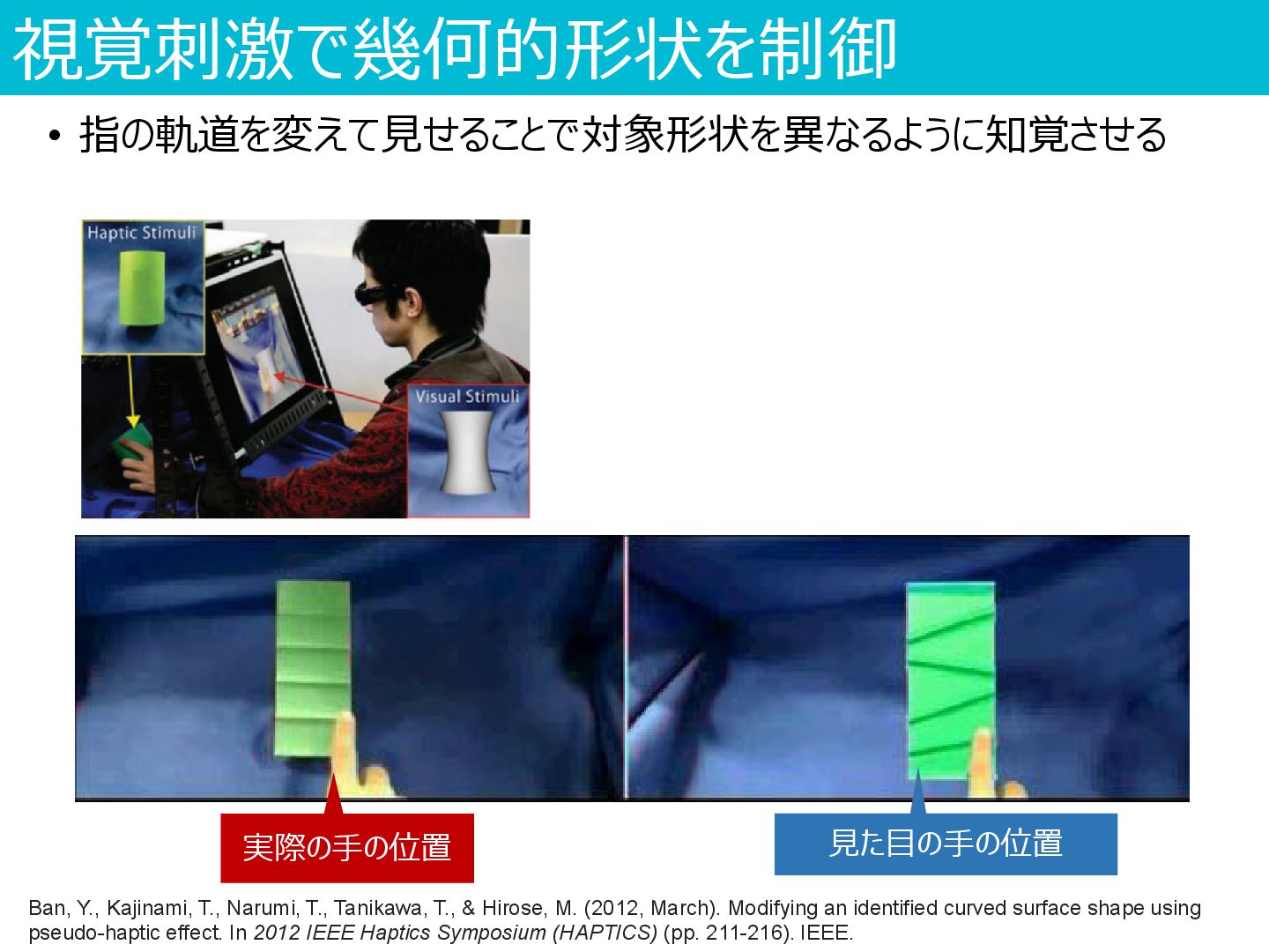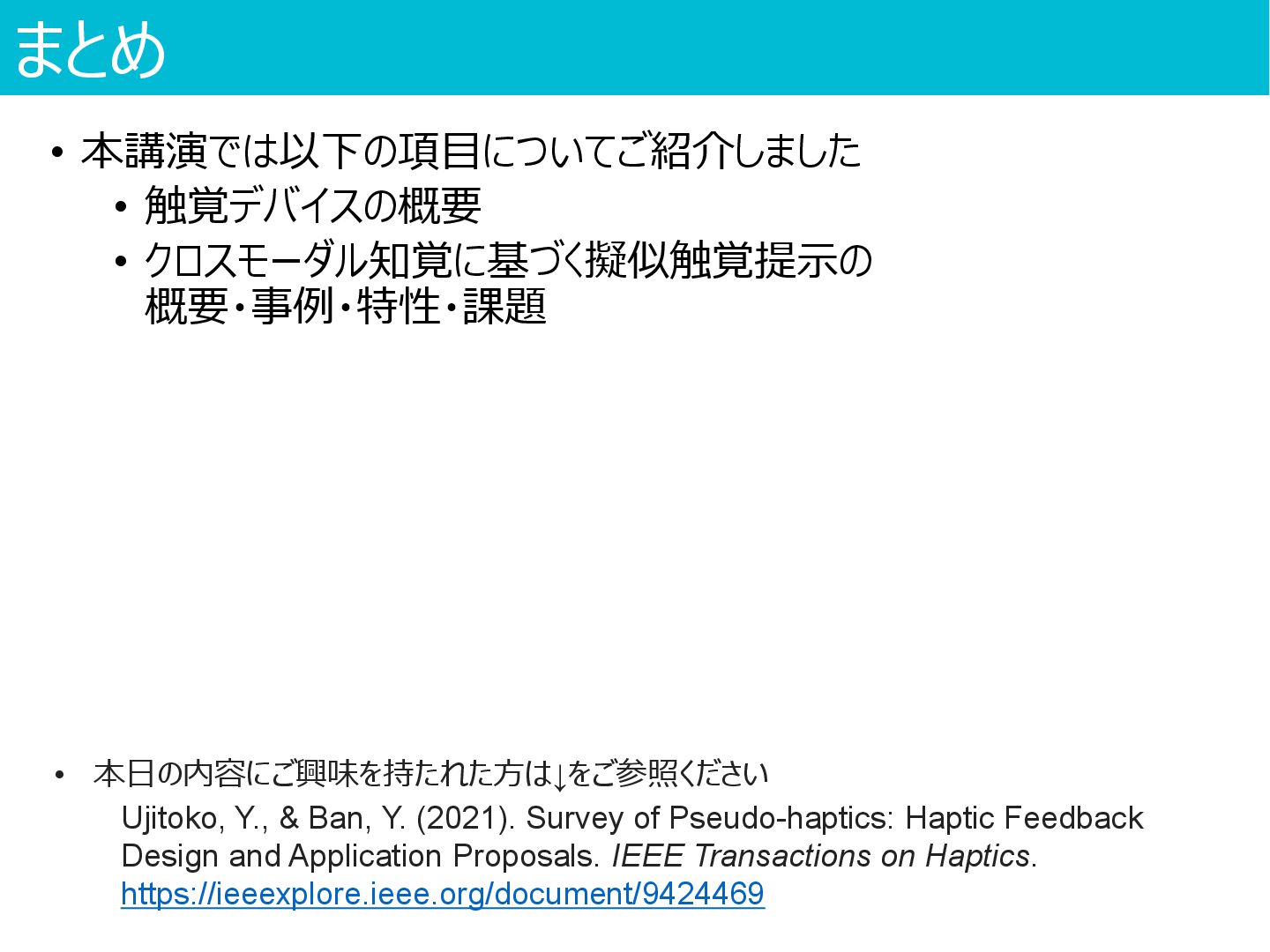 & Ban, Y. (2021). Survey of Pseudo-haptics: Haptic Feedback Design and Application Proposals. IEEE Transactions on Haptics. https://ieeexplore.ieee.org/document/9424469 • 本日の内容にご興味を持たれた方は↓をご参照ください