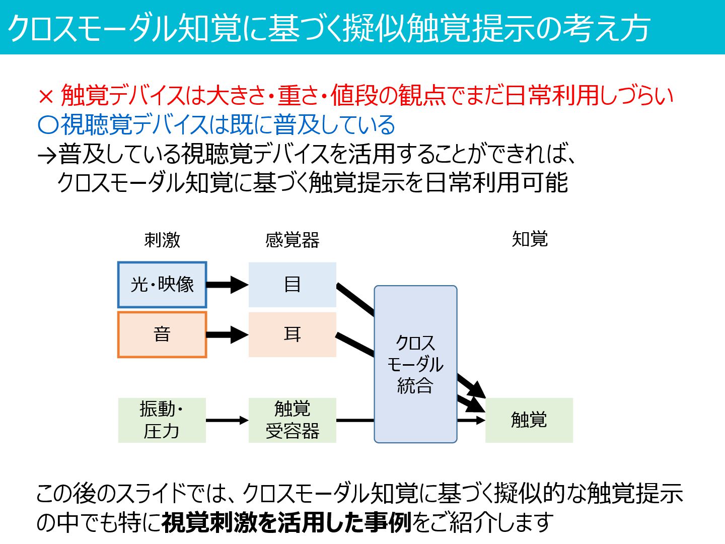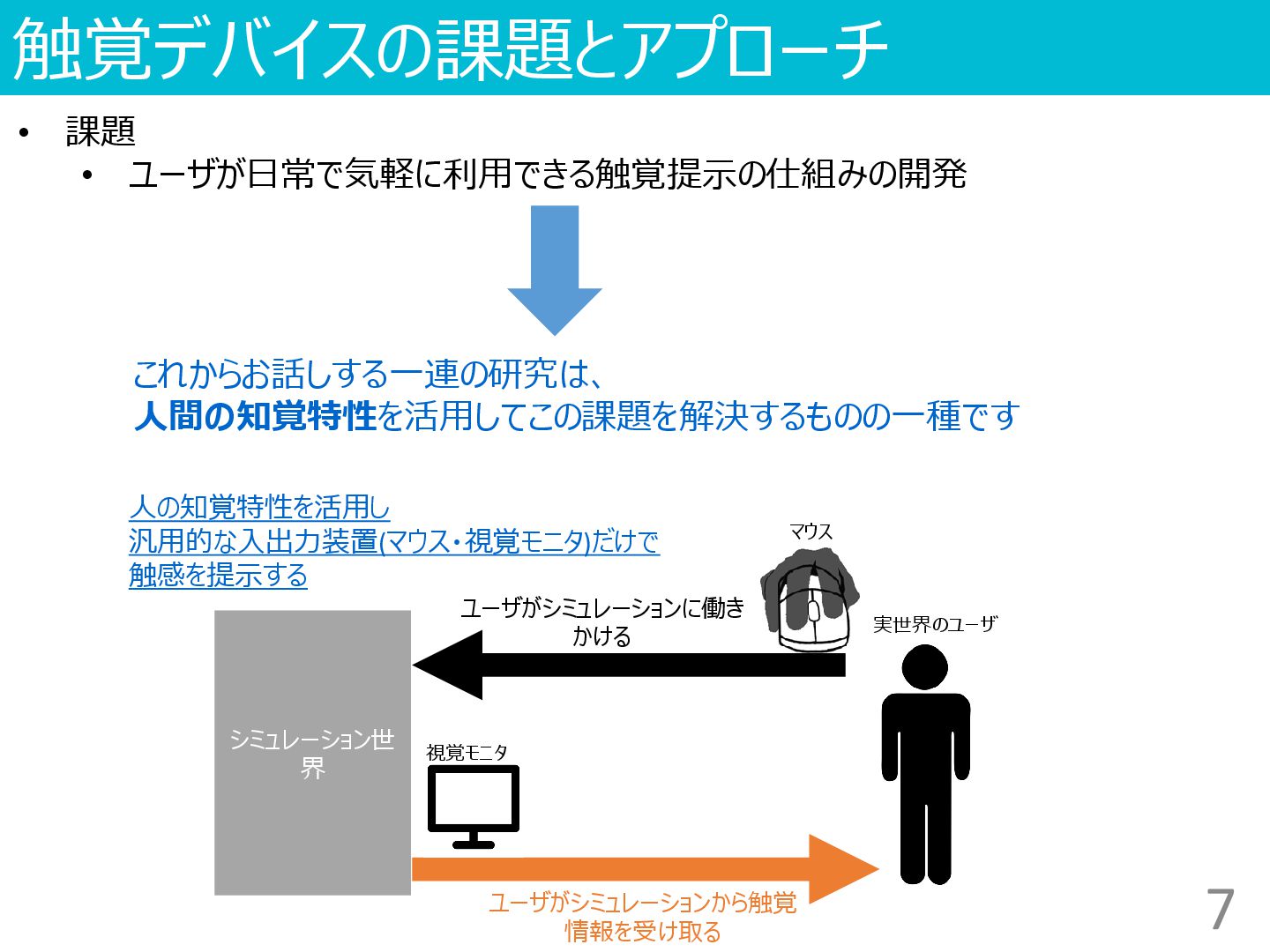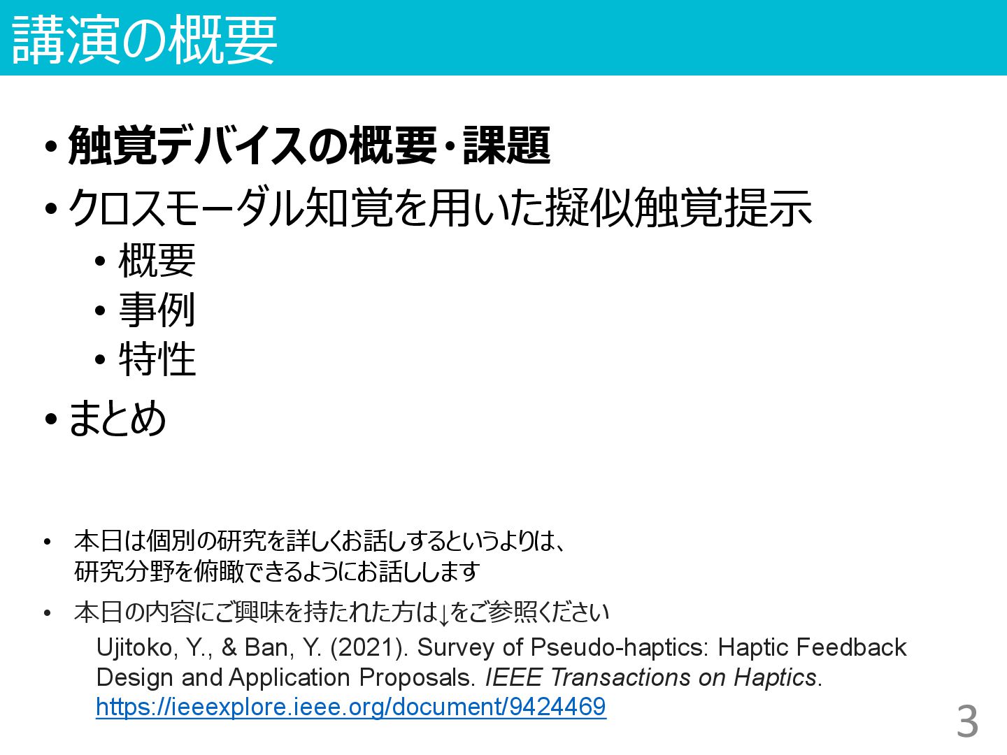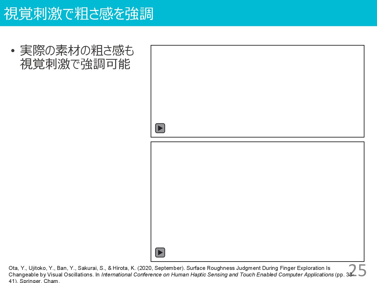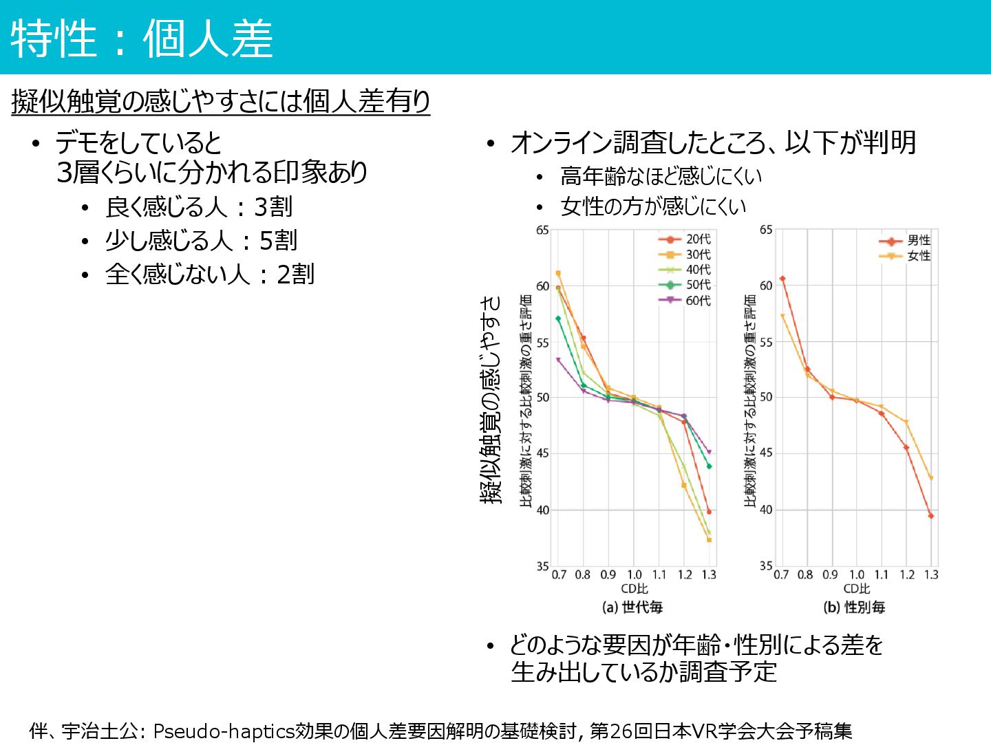 & Ban, Y. (2021). Survey of Pseudo-haptics: Haptic Feedback Design and Application Proposals. IEEE Transactions on Haptics. https://ieeexplore.ieee.org/document/9424469 • 本日の内容にご興味を持たれた方は↓をご参照ください